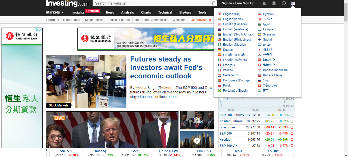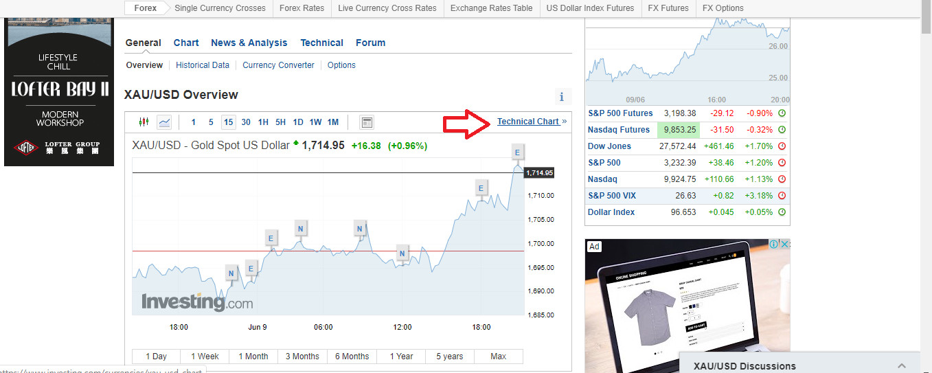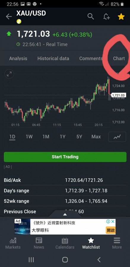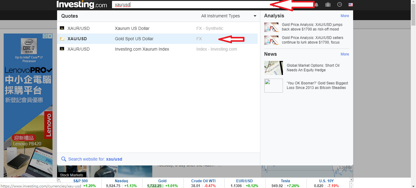 首先打開一個看金價功能比較齊全的網站,本人常用investing.com,進入後輸入 XAU/USD搜尋現貨黃金價格