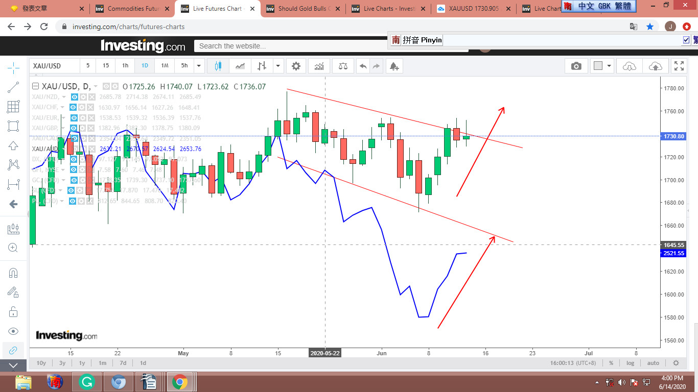上週五XAU虎頭蛇尾,留下長長的上影線,但我認為從上禮拜一起,XAU已經進入上升軌道,紅三兵不是說玩的,不應該輕言出場。萬一跌出上週三的紅棒實體(1714-15左右),小心謹慎的可以考慮出場