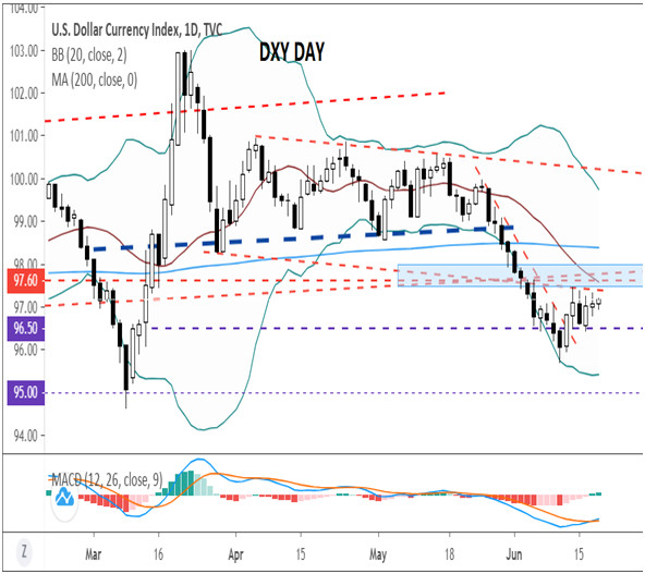 日圖顯示,6/18美元指數反彈連續多個交易日在阻力區域97.50-98.00區域下方停步不前,不能有效突破該阻力區域指數將有恢復5月份以來跌勢的風險。若下行,初步支持在96.50,有效下破該支持後續或將跌向96.00以及95.00。不過MACD指標的金叉指示恢復反彈的風險,若指數能夠有效上破97.50-98.00阻力區域,則可能迎來更大上漲空間。