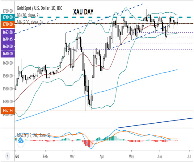 日圖顯示,黃金連續持穩布林帶中軌(20日均線1720),但是上行也未取得進展,日內的反彈再次在1740一線受阻,短線關注金價如何打破1720-1740區間。若持穩1720上行,上方阻力關注1740-布林帶上軌1750區域阻力,有效突破將打開進一步上漲空間。而若回落跌破1720,則可能進一步下行指向1700以及1690等支持水平。
