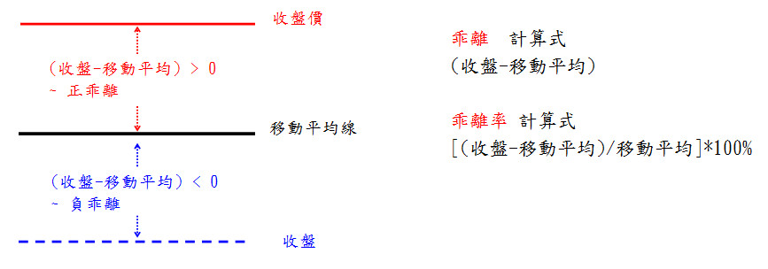 2.當 收盤價 小於 移動平均價時的乖離,稱為 負乖離。