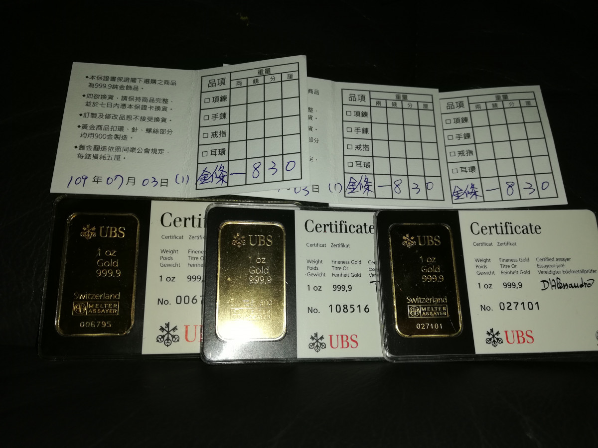 來留去送大 真的恭喜你,買的太划算了,我今天去了一趟詠信銀樓,買了三塊UBS 金條,總共157119元(他們只有三塊)他們今日報價6310/錢,我問他們網站上不是6250嗎?店家說那是台灣金的價錢😞國際認證價錢是6310