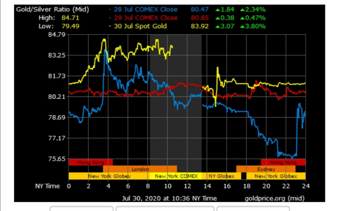 根據過去的經驗, 金銀比在70~ 90之間, 3/19海嘯時擴大到125, 已屬異常. 最近慢慢往歷史區間靠近. 現時 (10:22pm, Jul.30) 83.5, 進入合理範圍.