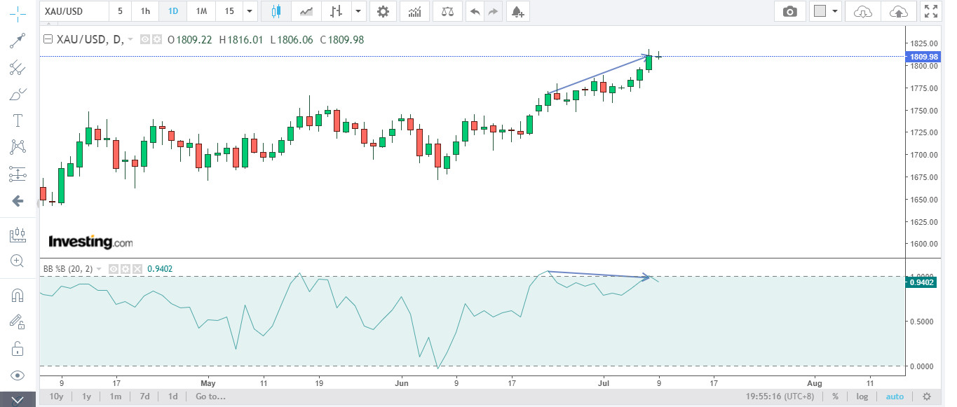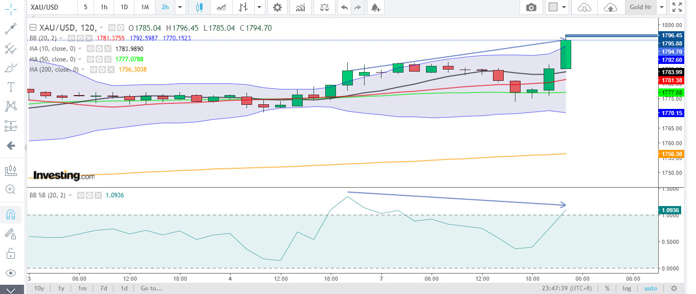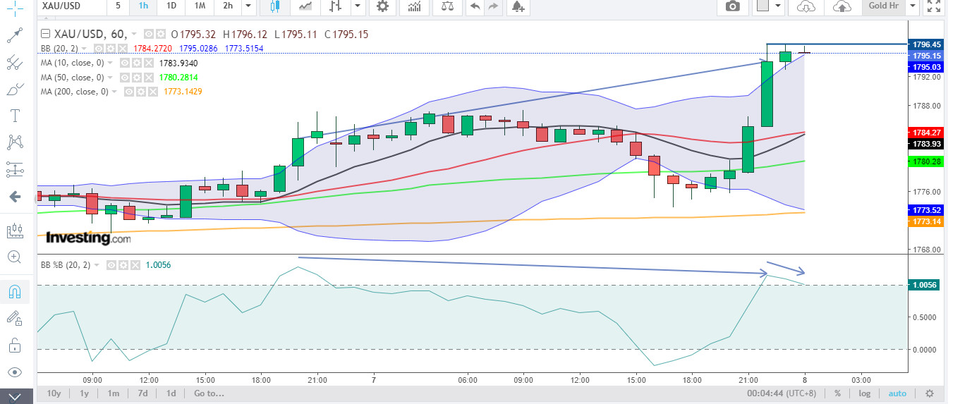 小時線圖暫時出現頂背馳,三個小時內,要BB%B突破1.2892才能改變頂背馳,否則有70%機會轉勢,如短炒的建議先將部份獲利
