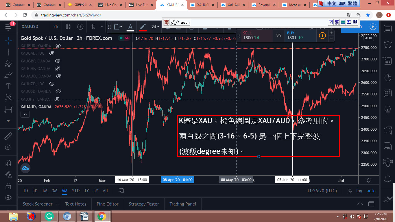 K棒是XAU;橙色線圖是XAU/AUD,參考用的。