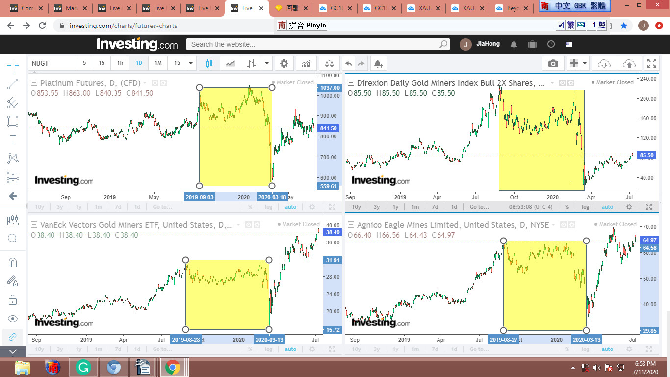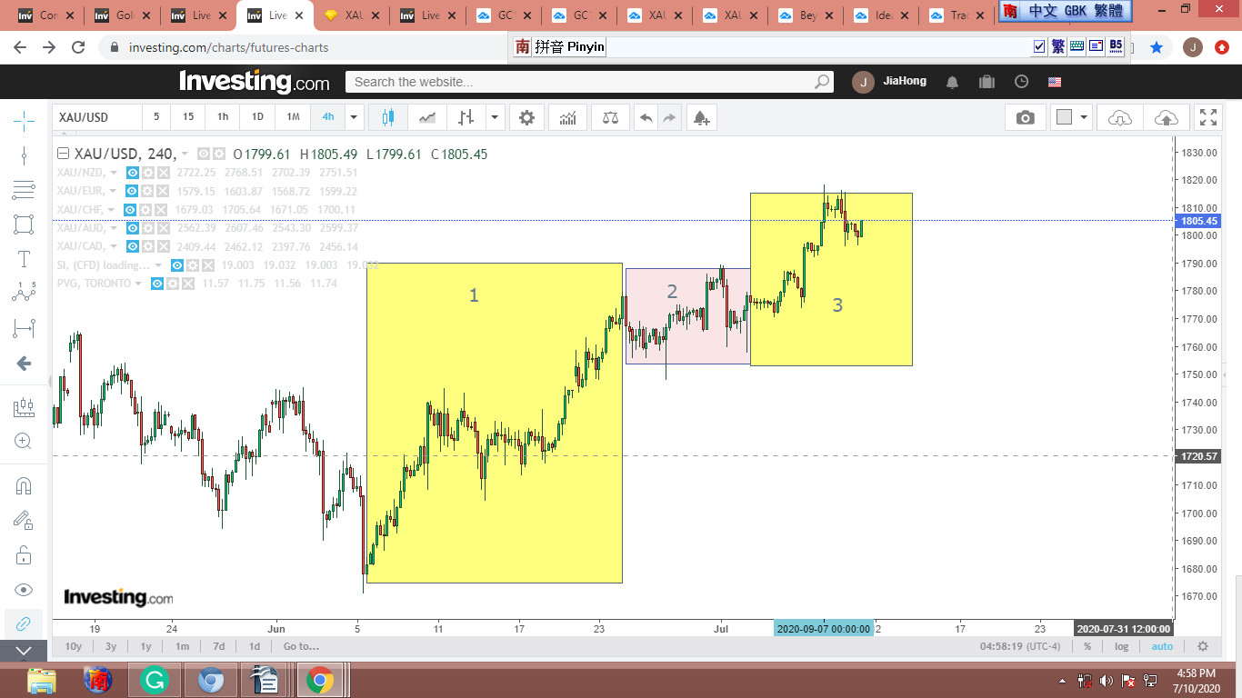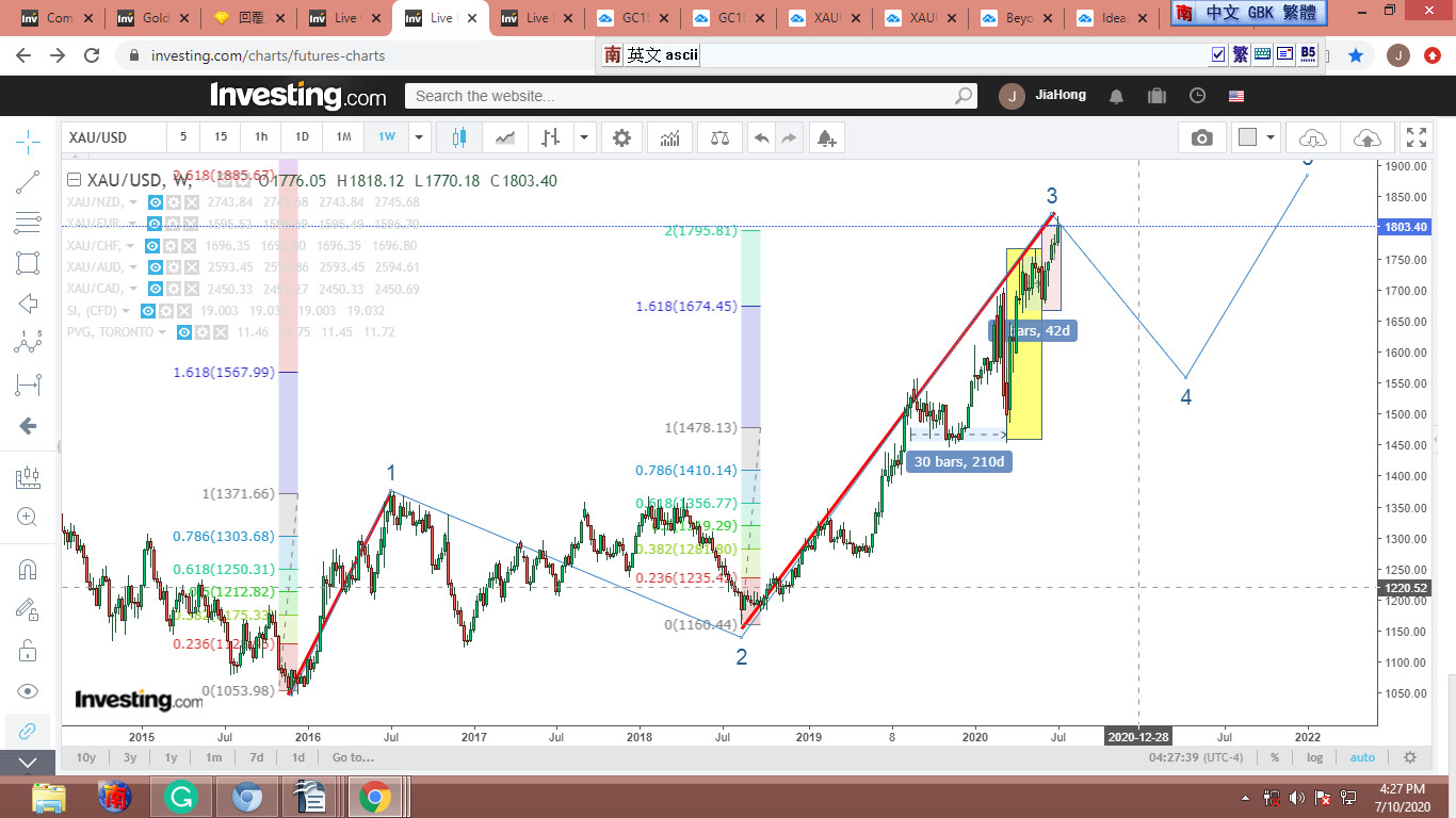 首先請看同時期的白銀期貨圖。黃框明顯是個上升波,而紫框是個典型的ABC修正波。這個圖形在黃金族群裡還蠻常見的,我挑了幾個,放在圖(2)裡。圖 3 是XAU、SI對照圖。XAU的ABC波段雖然沒SI那麼清晰,但也明顯可見。