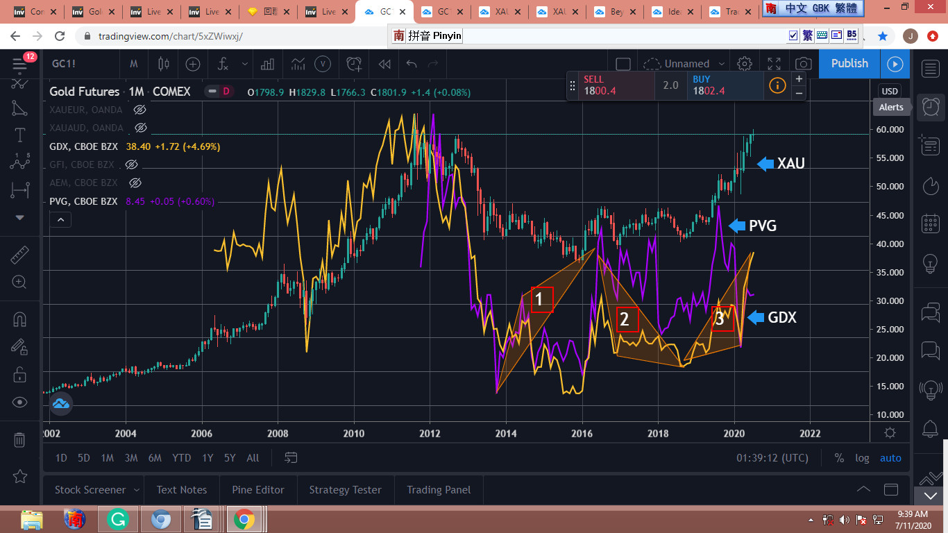 認不出一個人時,我常去觀察他的cousins;XAU不懂,我就看白金、白銀、和各大小金股,希望能認出一個輪廓。底下是我最近常端詳的“綜合圖”,我標示波段了W1,W2和W3,三角形沒什麼特別意義,只覺得好看。