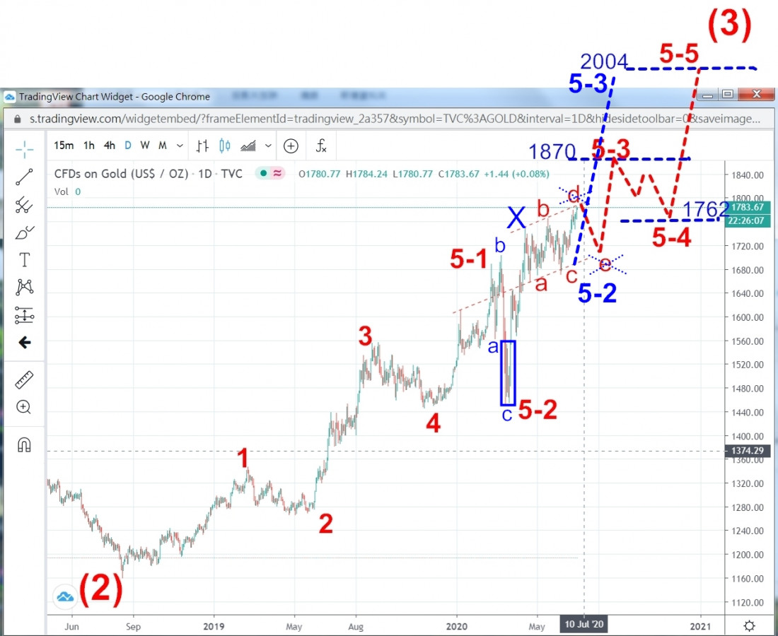 這幾天和Temp大討論從2018九月以來的金子波段,承他抬愛,送我底下的這幅愛氏波段圖,并詳細解說各波段的要義,研讀再三,獲益不淺。基本上,我同意他精心構想的未來波形,但覺得圖形似乎可以再分割簡化。