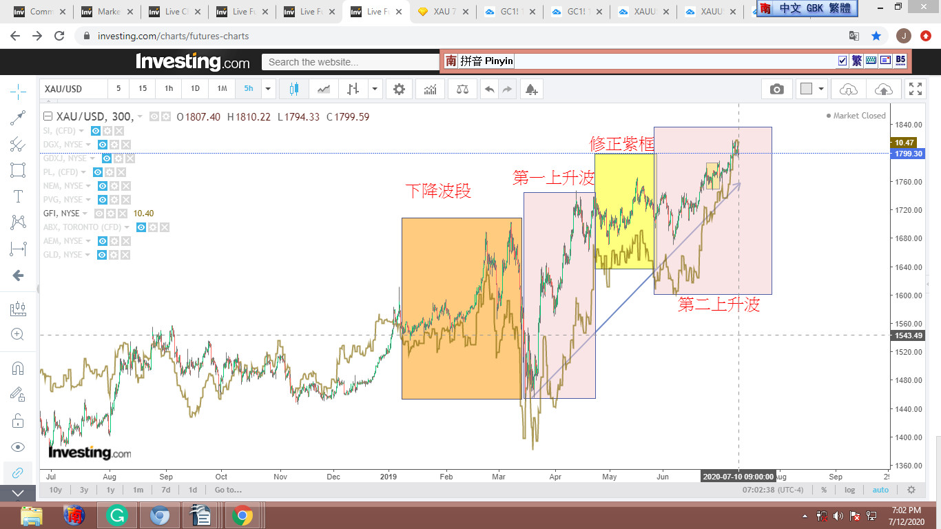 第二個紫框是進行式;和第一個紫框相比,它太小,不可能是整個上升波。另一個可能性是:黃框是A,第二個紫框是B,馬上C就要來,大力拉下金價。但這樣的話,ABC會是一個大號修正波,但修正誰呢?放眼往左看,我見不到大號上升波,尤其是我們年初才經過一個翻天覆地的修正(橘框)。