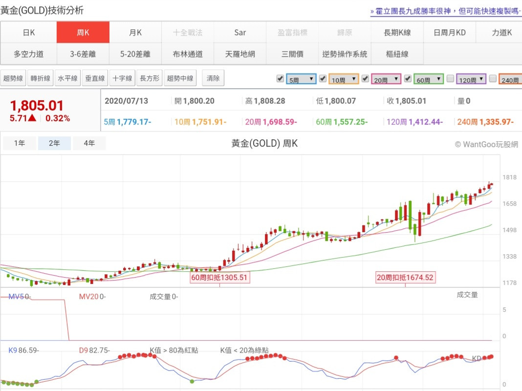 周線K值處於(6/12 K70 H1744 L1680),目前(7/14 K85 H1813 L1796)