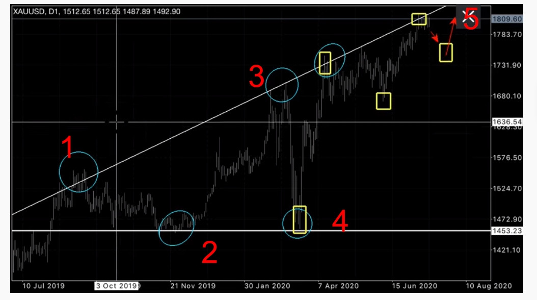 他這週的評論叫我吃驚,居然也用波浪理論和常見線形(大聲公)。他認為黃金已爬過五波,接下來走的是ABC修正波,而且A波已經走了將近2/3了。
