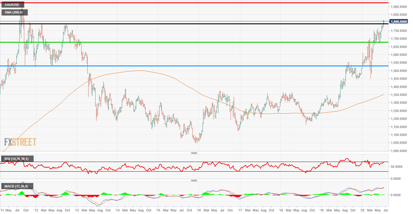 黄金周线图显示,价格保持在自2011年9月以来的每盎司1802.92美元的先前合并高点上方。价格仍可能达到甚至打破历史最高点,但可能首先需要回撤。这就是图表中标记所有其他支撑位的原因。下行的下一个主要水平是绿线,每盎司1677.15美元。很难看到价格与当前水平相差太远,但在此之前,每盎司1750-1700美元可能也是强劲的支撑。
