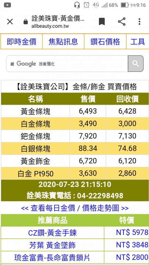 我是看YouTube 鄭港快頻道,上個月鄭大大介紹白銀時我看到台中詮美銀樓報價1公斤20004元,然後我去當天它提早關店,我錯過後就沒在去管他,昨天白天我刷卡買1公斤23318元,今天傍晚我再去買1公斤25041元,比之前多8355元,等於一塊我多花了4177元去買它.... ...XD