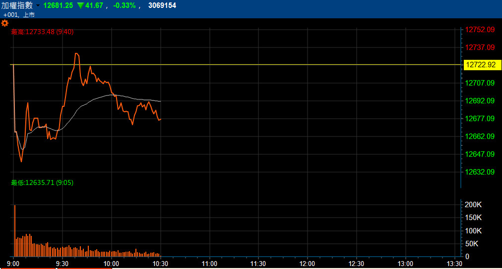 台股今日開盤12,653.46點,下跌69.46點。台積電(2330)開盤下跌8元,開盤價426元。