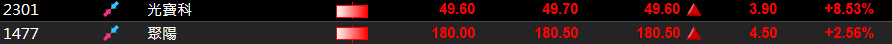 光寶科2301::今天以漲8.53% 收盤價 49.6元收盤,盤中表現一路上揚衝到漲停,收盤前受大盤影響使股價打開漲停從50.2元跌至49.6元。