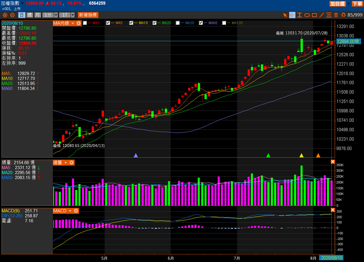 美中因網路封鎖科技戰干擾全球股市,亞股周一呈現震盪,不過台股呈現相對強勢,台股今日開低走高,在鴻海(2317)領漲、台積電、聯發科等電子權值股紛紛翻紅,加上金融、台塑四寶等權值股穩步走揚,支撐市場信心下,收盤仍守穩 5 日線之上,成交量較前一交易日量縮。惟 OTC 指數相對弱勢。盤面資金聚焦電子集團權值股、PCB、航運及風電綠能相關個股,終場指數上漲 65.13 點,漲幅 0.51%,收在 12,894.00 點,成交金額為 2,157.31 億元。三大法人合計買超 27.06 億元:外資買超 27.24 億元、投信賣超 13.16 億元、自營商買超 12.97 億元。
