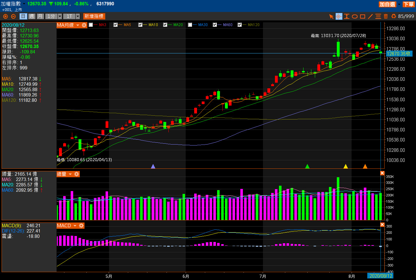台股今 (12) 日受電子、傳產權值股熄火影響,加上主要亞股普遍走跌,拖累加權指數連續兩天重挫逾百點,資金回頭改抱先前遭調節的生技,次族群中則由 PCB、太陽能等領軍,終場在台積電、聯電權值股壓盤下,指數下跌 109 點收在 12670.35 點,成交量 2159.72 億元,成交值維持在 2000 億元之上,三大法人合計賣超 152 億元,其中光是外資就大砍逾百億,在權值股無力下大盤面臨回測月線壓力,短線大盤還須時間消化財報消息面的壓力,投資人普遍利用 7 月營收和半年報公布利多的時機進行籌碼換手,目前財報公布接近尾聲,大盤雖維持高檔整理,但個股大漲大跌的兩極化現象持續發生,已經跌破 12 日線的多頭波段支撐,若無法快速站回, 盤勢將有轉弱的疑慮。