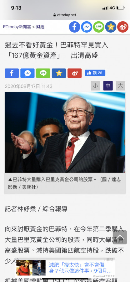 大大好,小弟認為巴菲特已經成為反指標了,誰能從他身上咬下一塊肉都是大賺,黃金現在有極大的風險了。