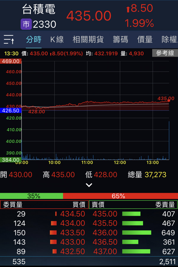 回覆 嗨爪主席:今天429.5買進,買上掛435賣出⋯終...