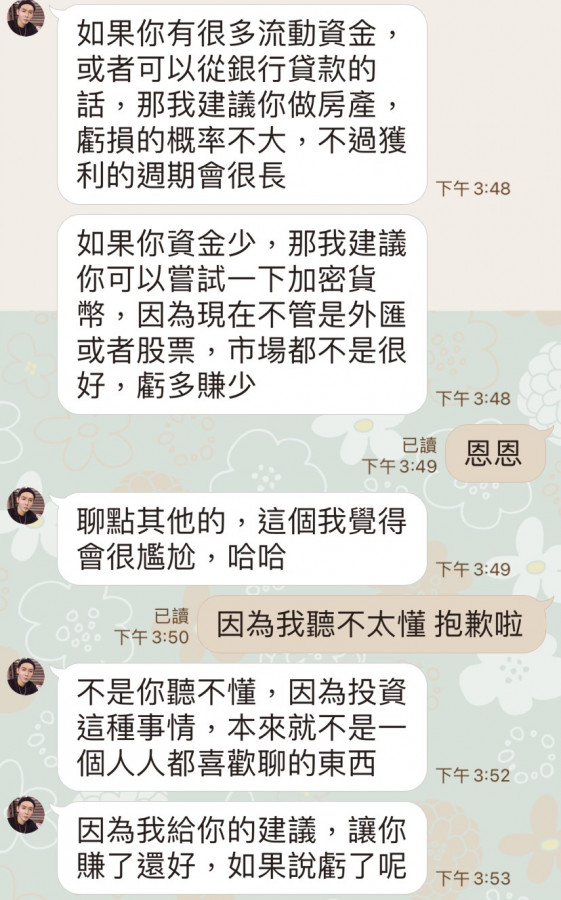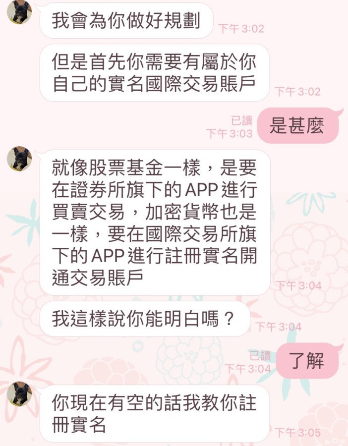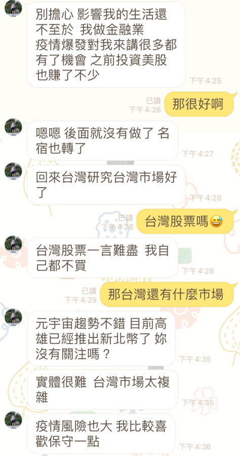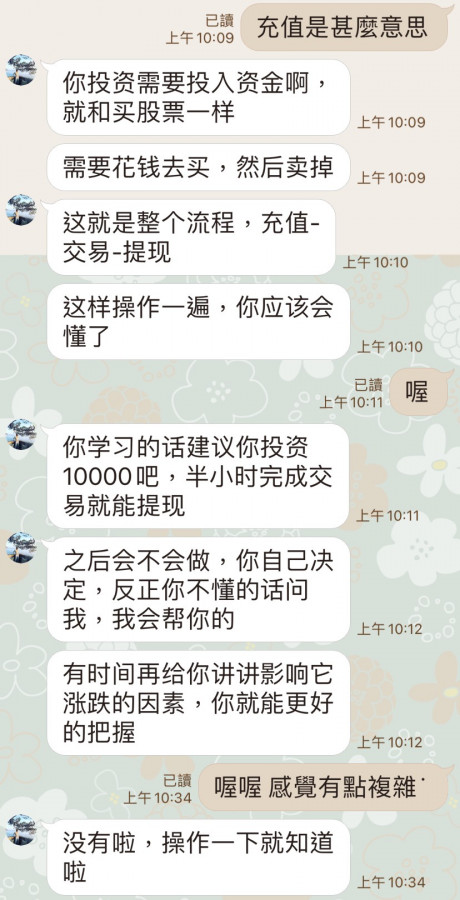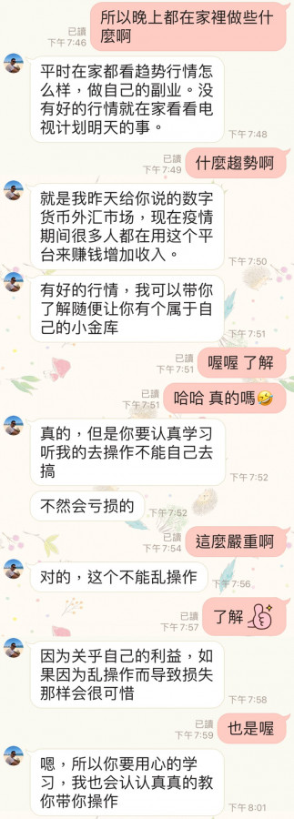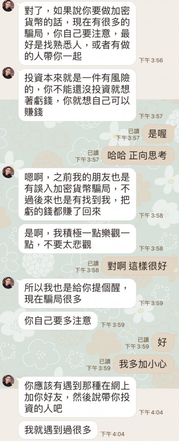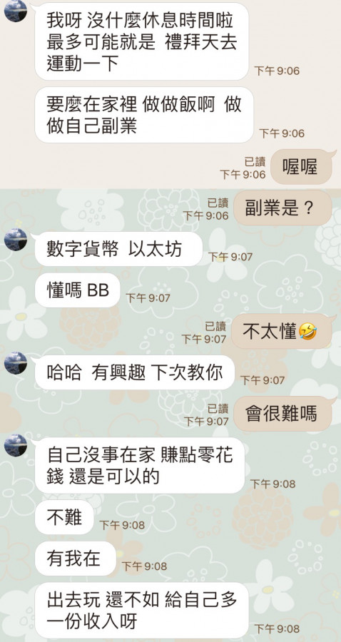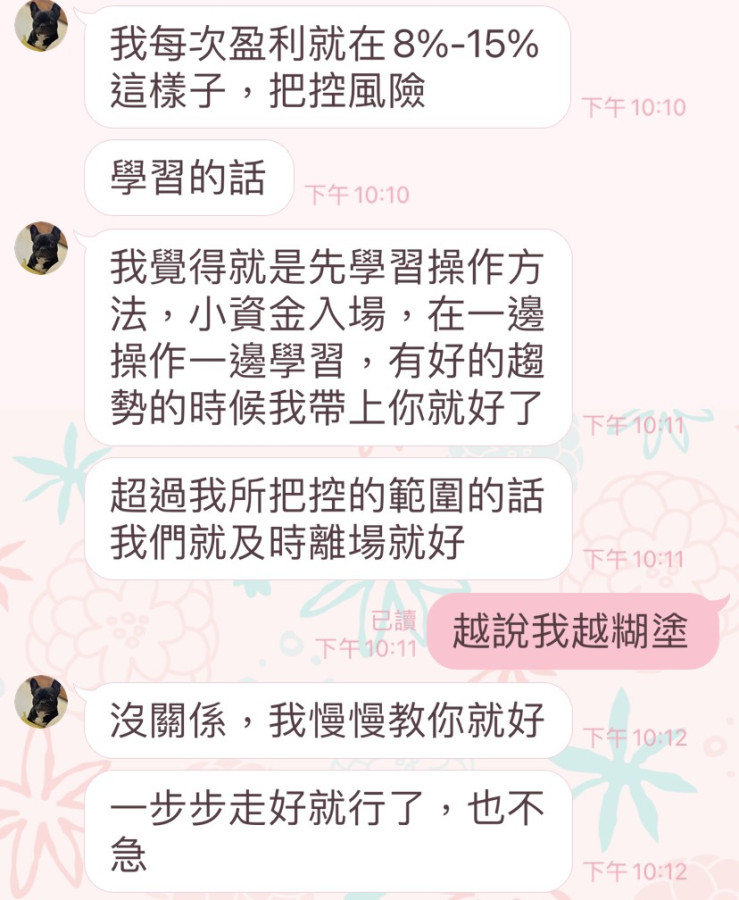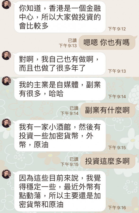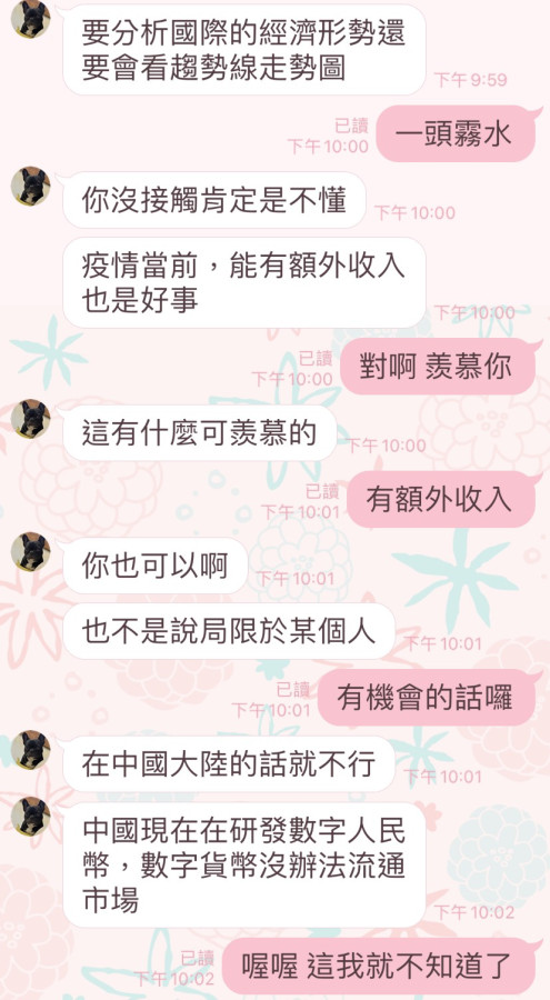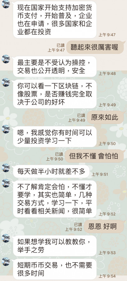 他一開始就貼他投資數字貨幣的截圖, 獲利金額都很大, 我只是好奇想說這樣的投資需要投入多少資金才能賺, 加上疫情悶在家, 心情很不好, 才會想說看能不能賺些額外收入, 也是有貪念, 才開始讓他覺得我可以得逞吧!