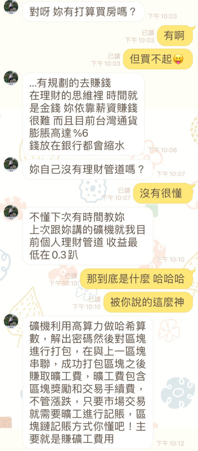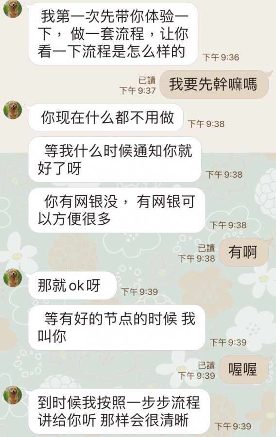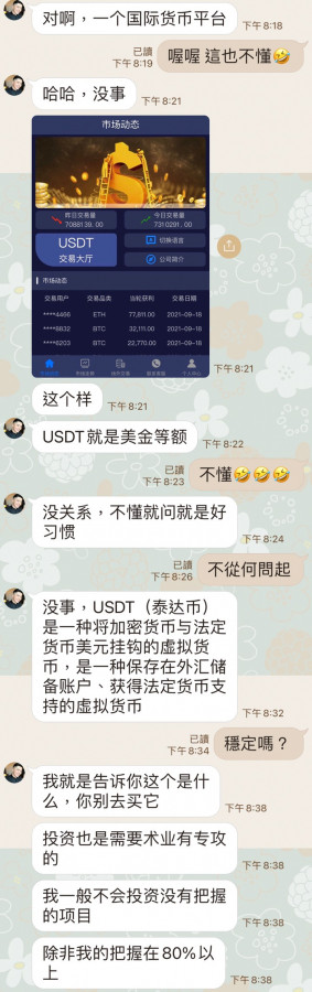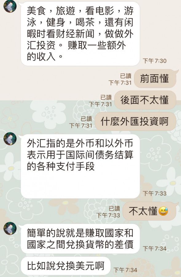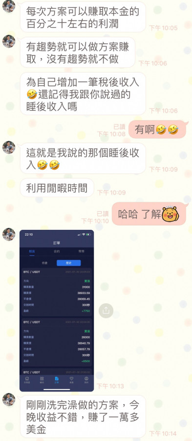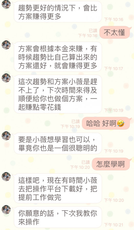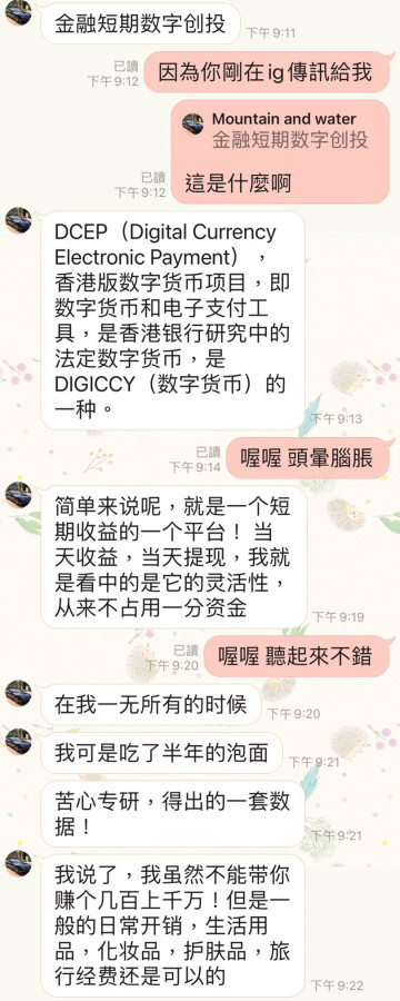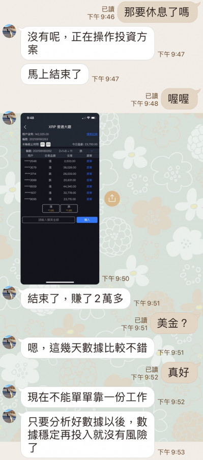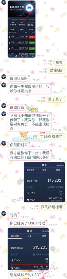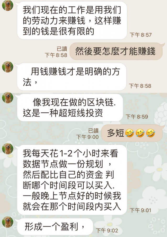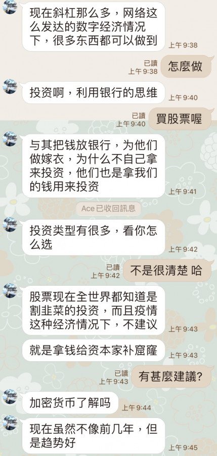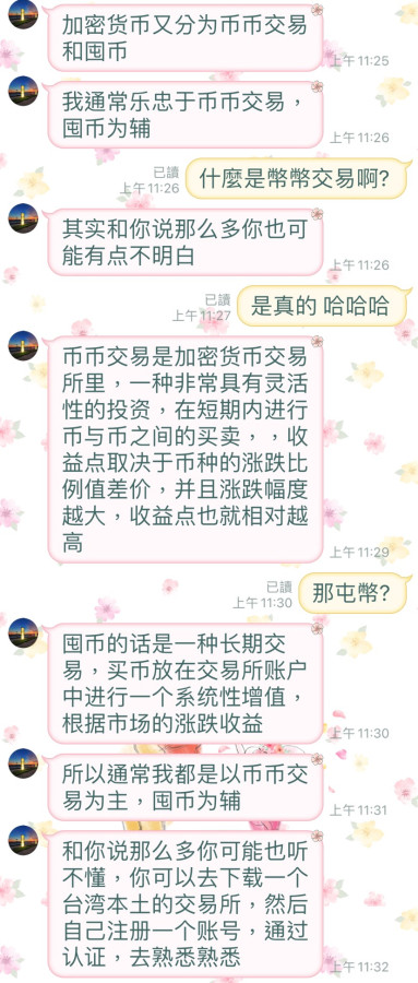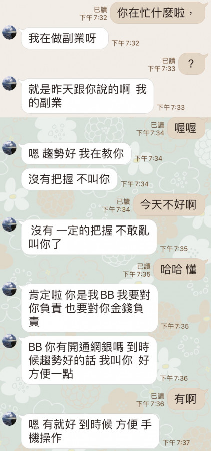 他一開始就貼他投資數字貨幣的截圖, 獲利金額都很大, 我只是好奇想說這樣的投資需要投入多少資金才能賺, 加上疫情悶在家, 心情很不好, 才會想說看能不能賺些額外收入, 也是有貪念, 才開始讓他覺得我可以得逞吧!