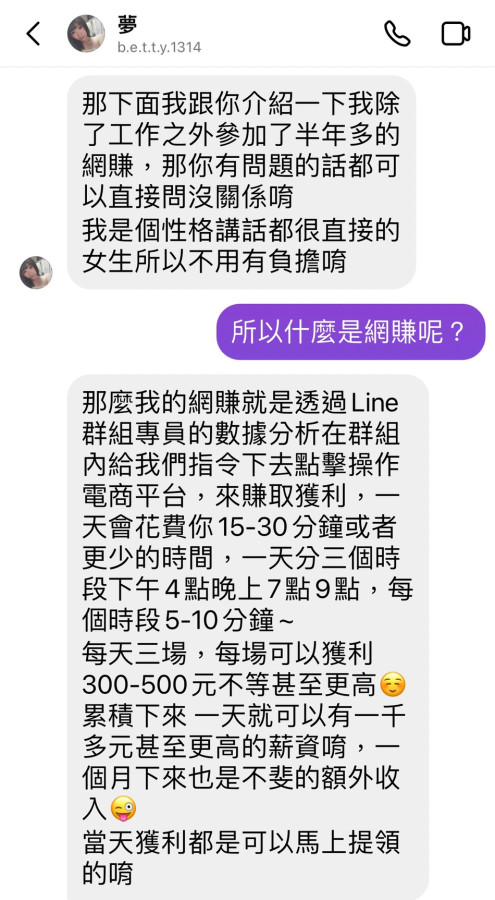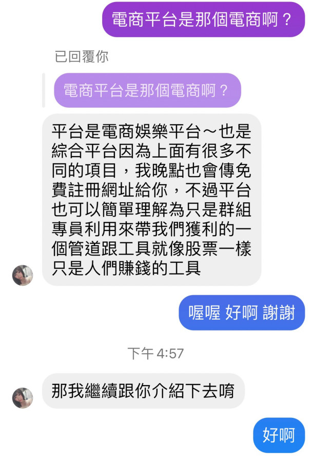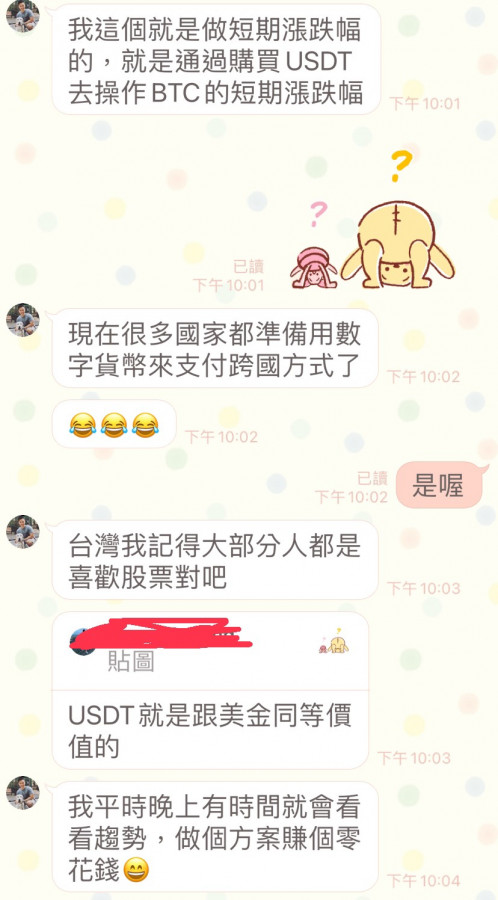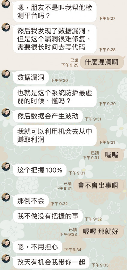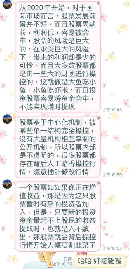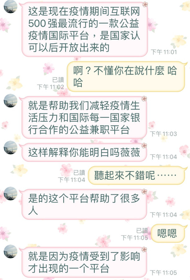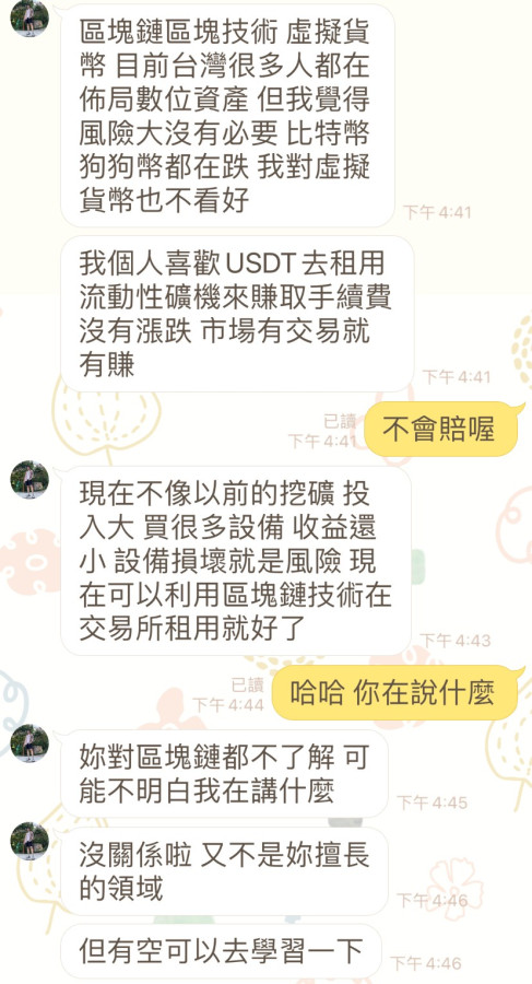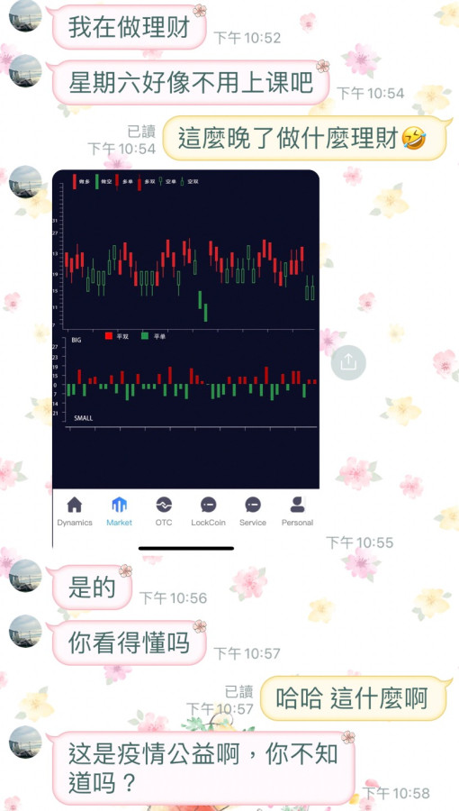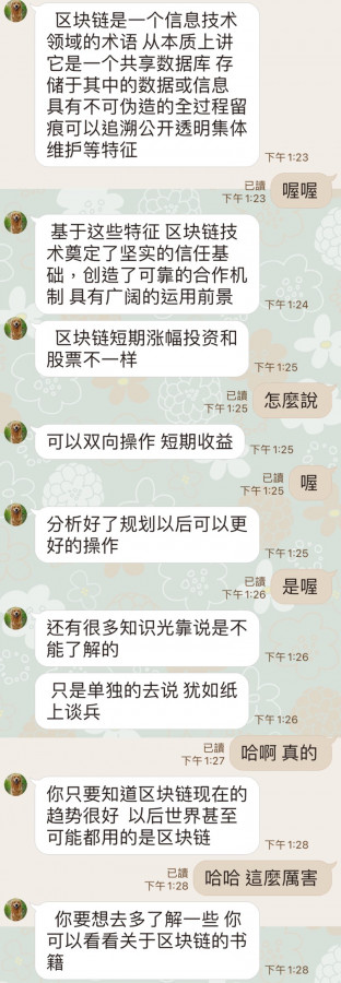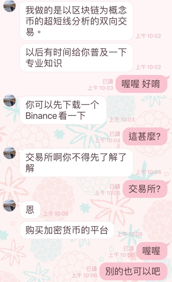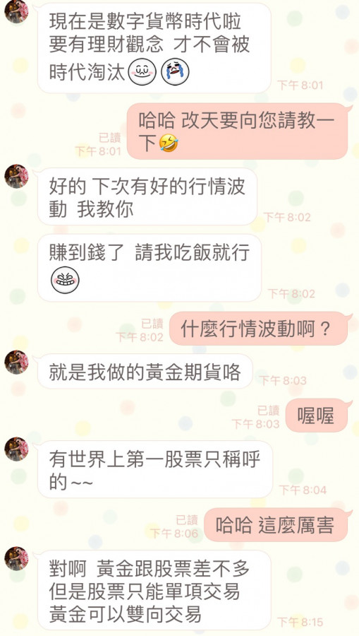 他一開始就貼他投資數字貨幣的截圖, 獲利金額都很大, 我只是好奇想說這樣的投資需要投入多少資金才能賺, 加上疫情悶在家, 心情很不好, 才會想說看能不能賺些額外收入, 也是有貪念, 才開始讓他覺得我可以得逞吧!