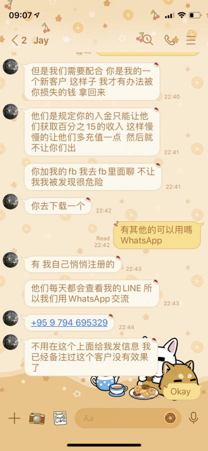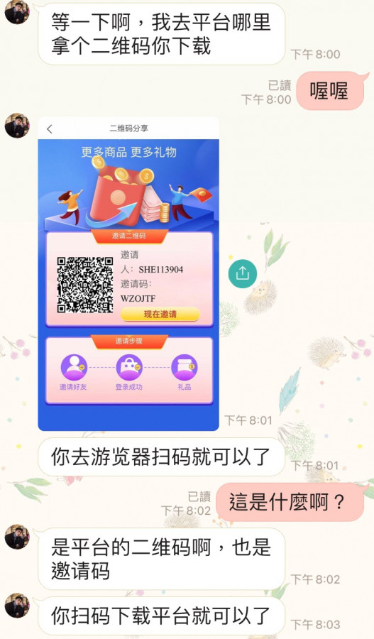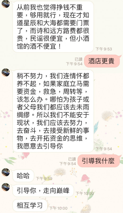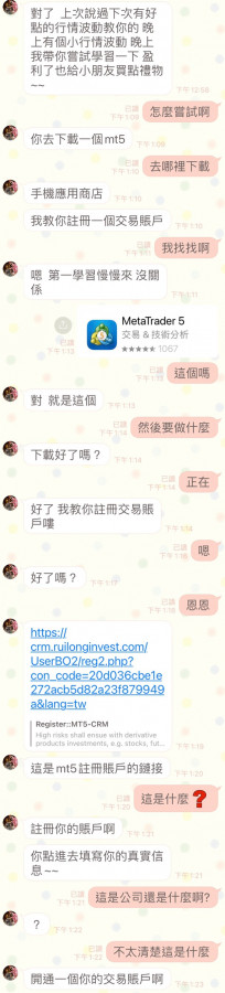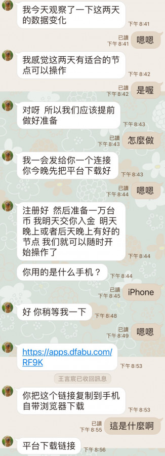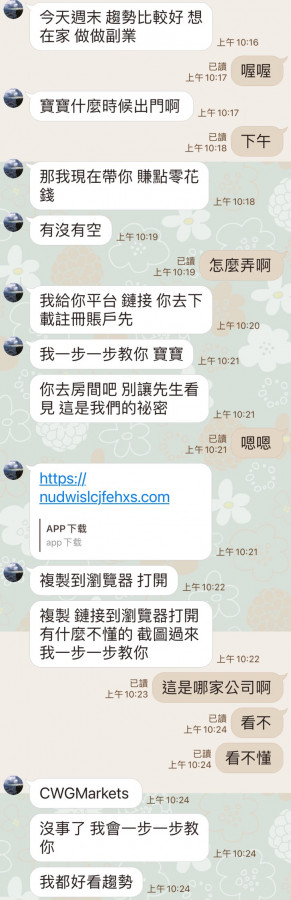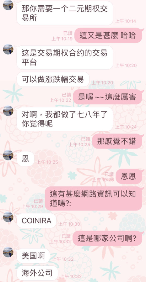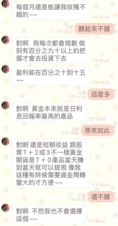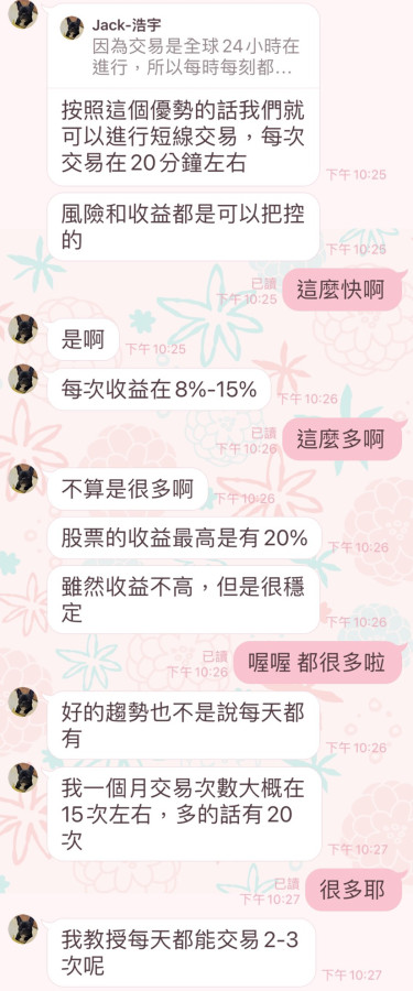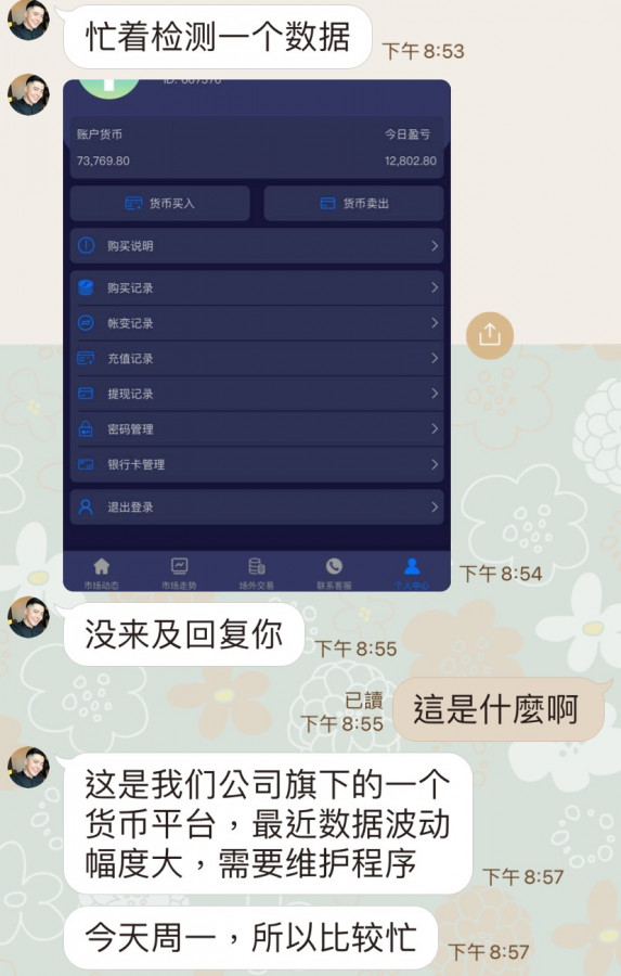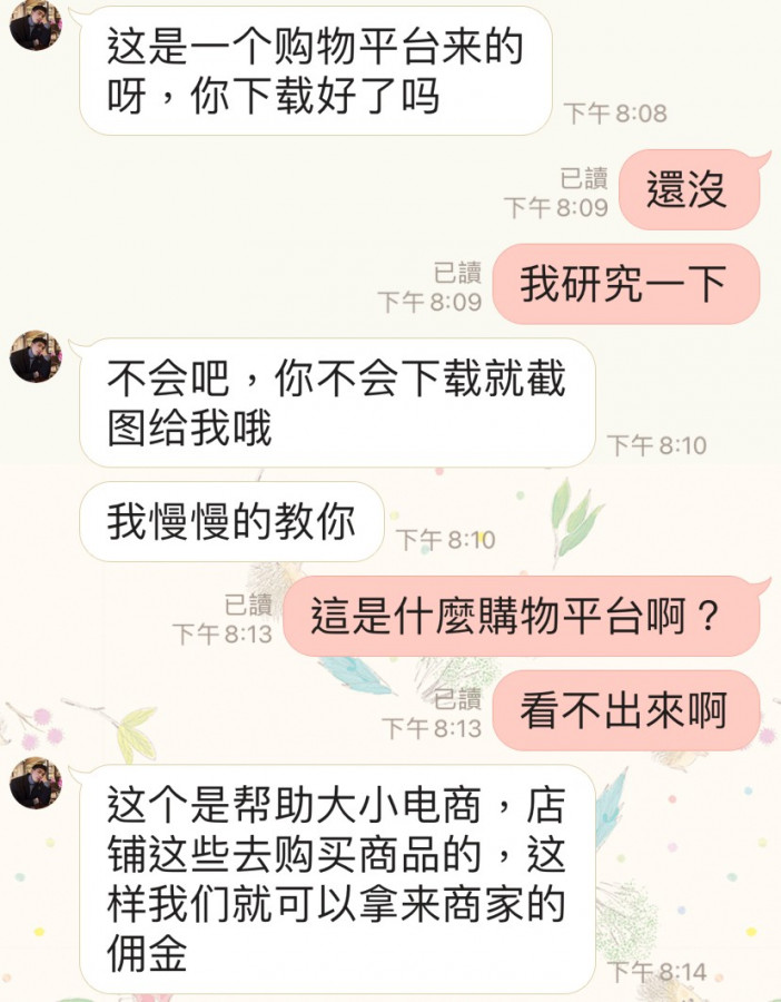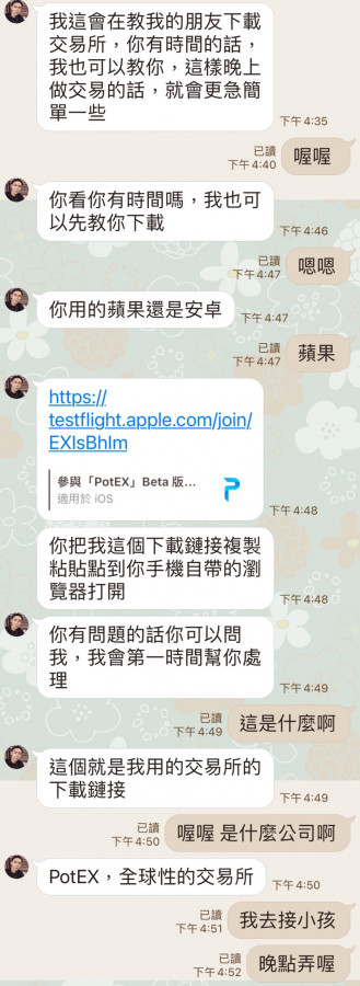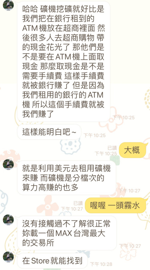 他一開始就貼他投資數字貨幣的截圖, 獲利金額都很大, 我只是好奇想說這樣的投資需要投入多少資金才能賺, 加上疫情悶在家, 心情很不好, 才會想說看能不能賺些額外收入, 也是有貪念, 才開始讓他覺得我可以得逞吧!