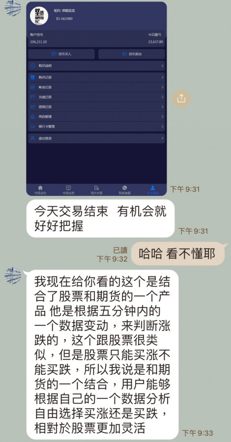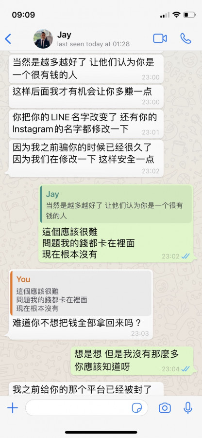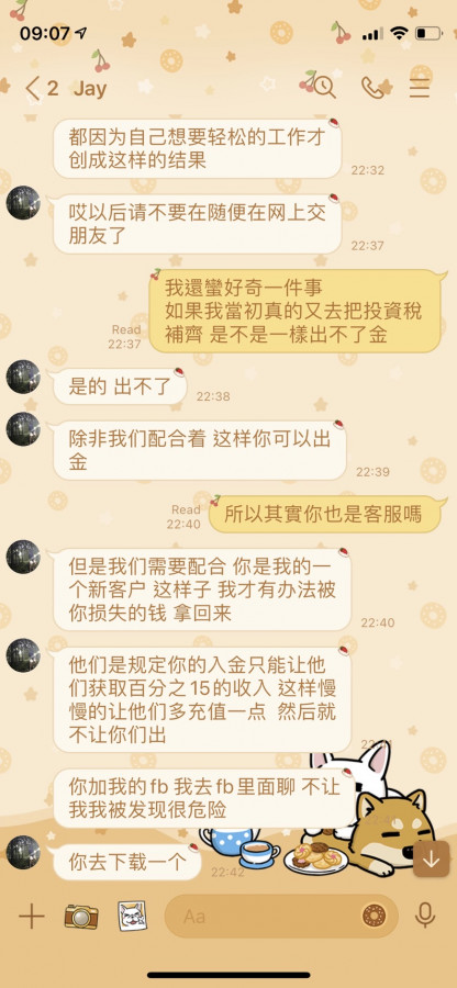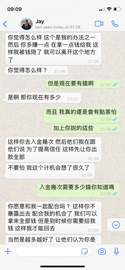 再來他還不死心, 一直叫我把我自己的存儲險什麼的解約, 能拿多少就拿多少, 因為這一波好行情不要放棄, 我是有點不耐煩, 想要出金了, 但.......就這樣, 第二次出金就出不成了, 說要做到流水量或補齊金額才能, 我真的很不甘心卡在裡的錢, 就去補足! 再來一樣出不了, 我的資金有涉嫌洗黑, 要繳保證金, 我真的超不甘心又去補, 再來又說要繳投資稅才能出金!