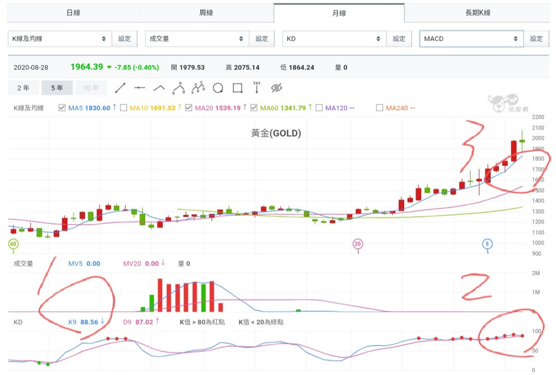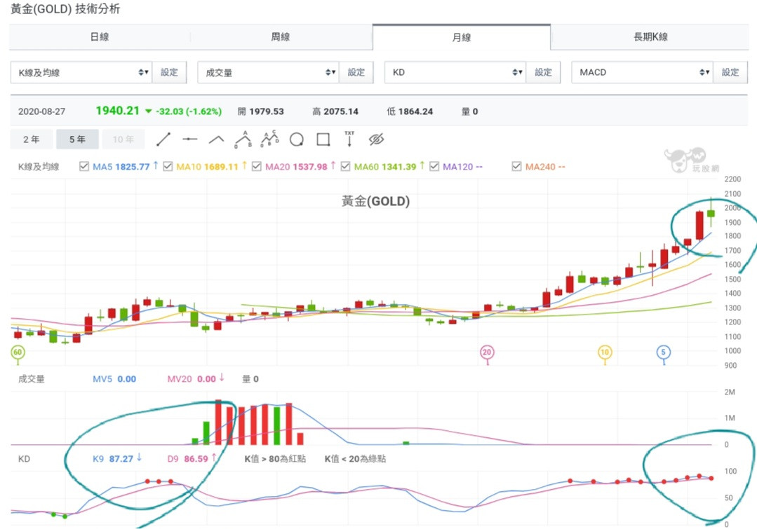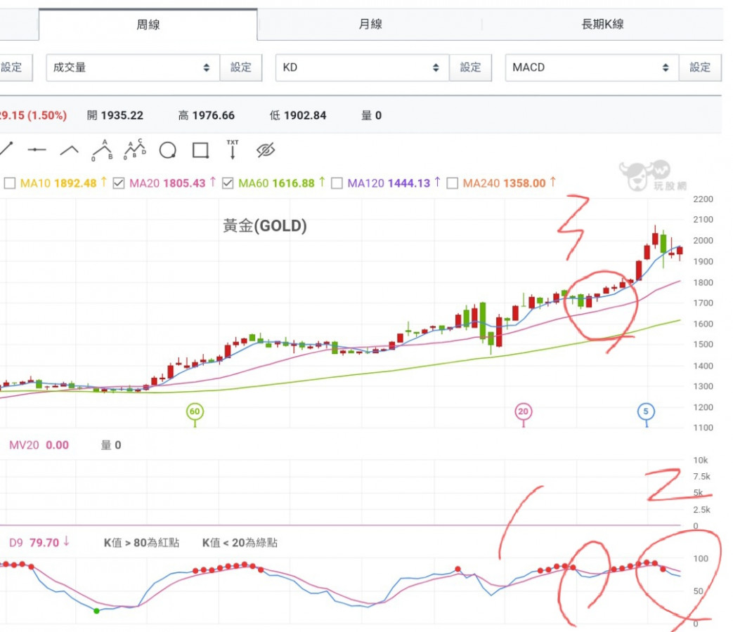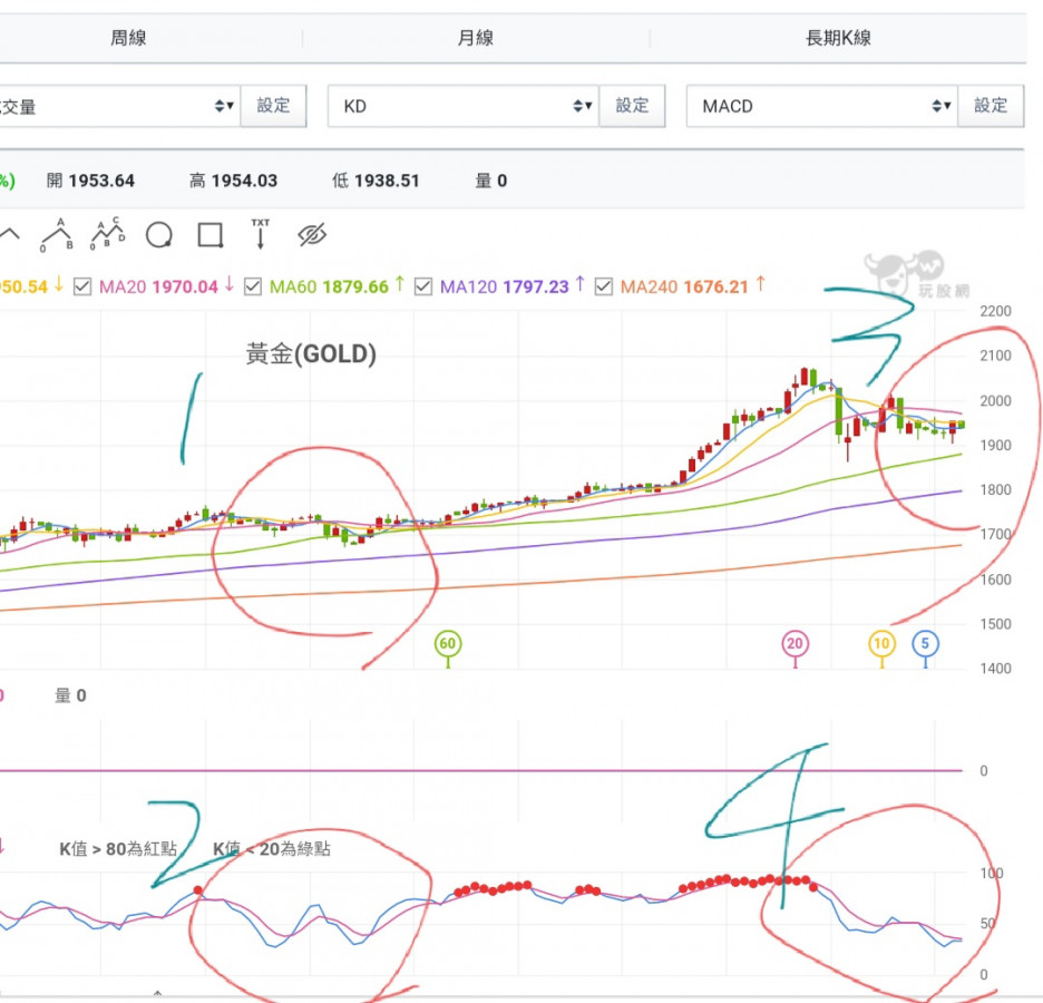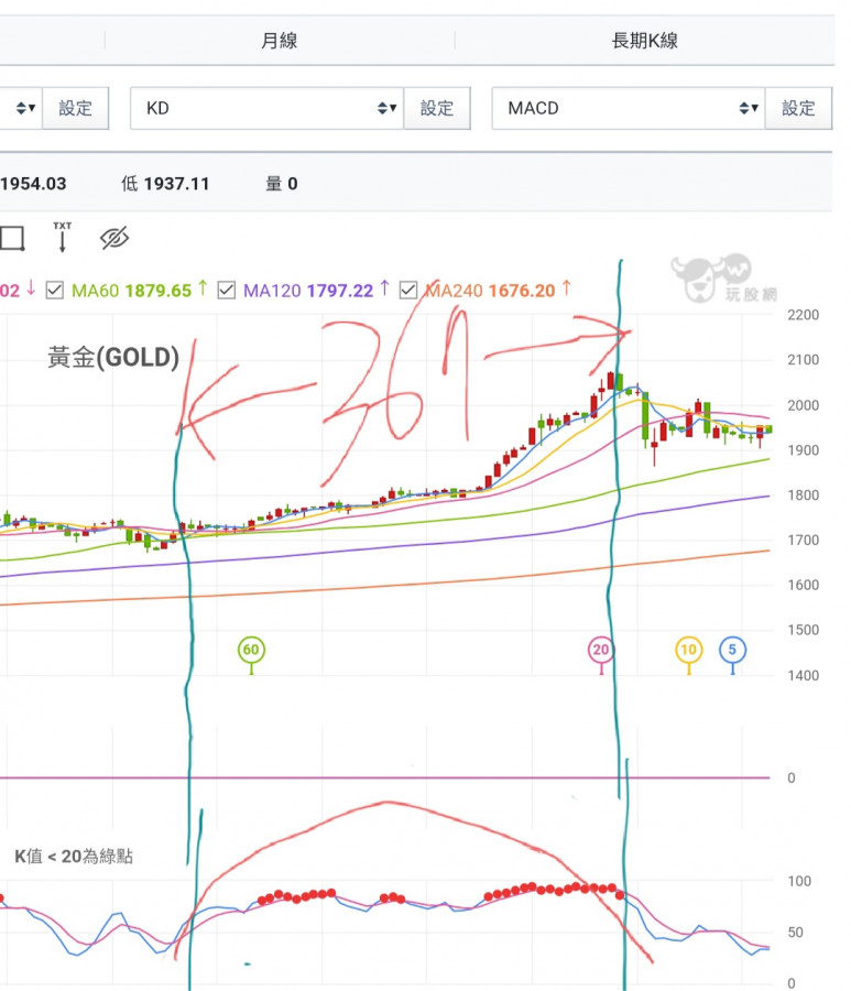 記住!當下跌KD開口越大反轉/反彈的幅度也會相對較大,以月~週~日次序觀察。過去KD高檔震盪時K與D的開口很大(K與D大概在5的距離),所以當月K值下跌5之際,在還沒正式交叉金價的跌幅在(-200)左右,再看週KD跌的位子,再看日KD跌的位子(超跌),逐一檢查完全後再看(金價)回升的速度與範圍,顯示金價強過KD值標也就是月線(價不跌;跌K值),週線(價不跌;跌K值)。