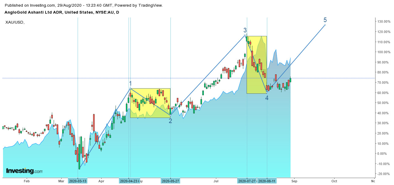 無奈之下,我參考南非金礦Ashanti的線圖,判斷XAU走的是上行波段,圖中波段1-2-3清晰可辨,而波段4時間上略嫌短些,有待觀察。