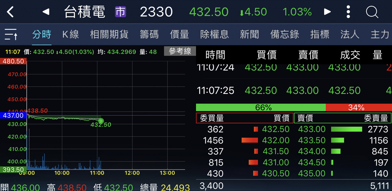 剛剛一瞬間從438下殺434.5