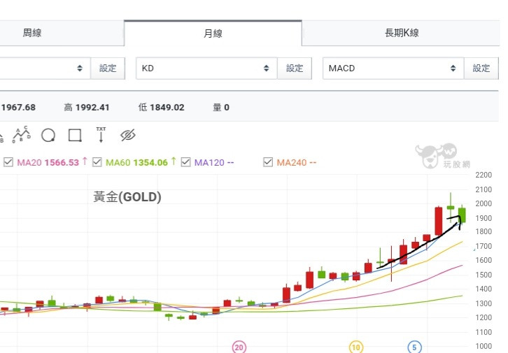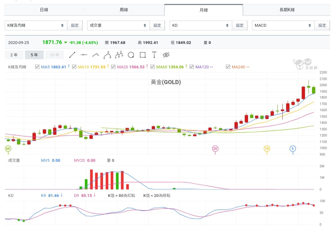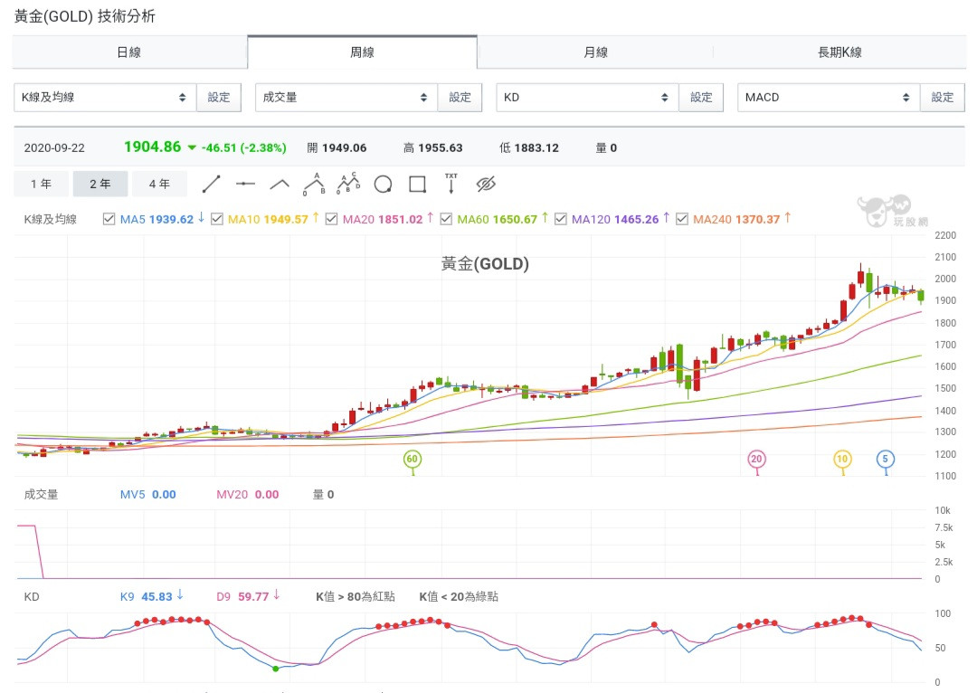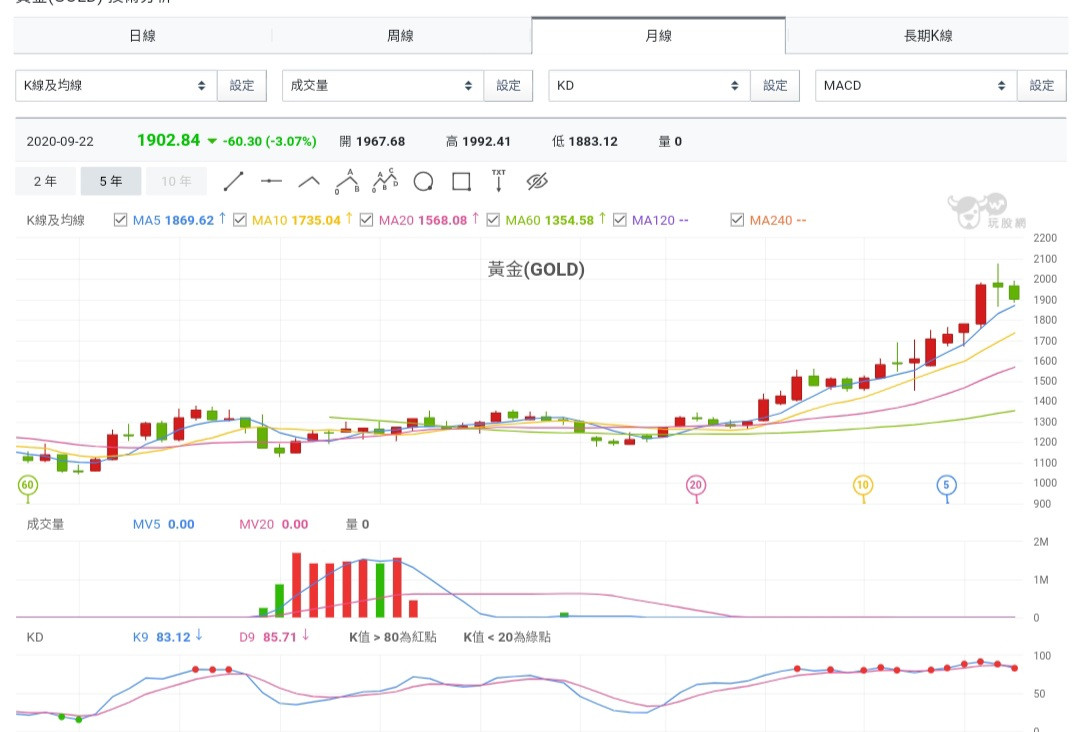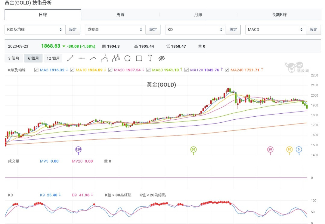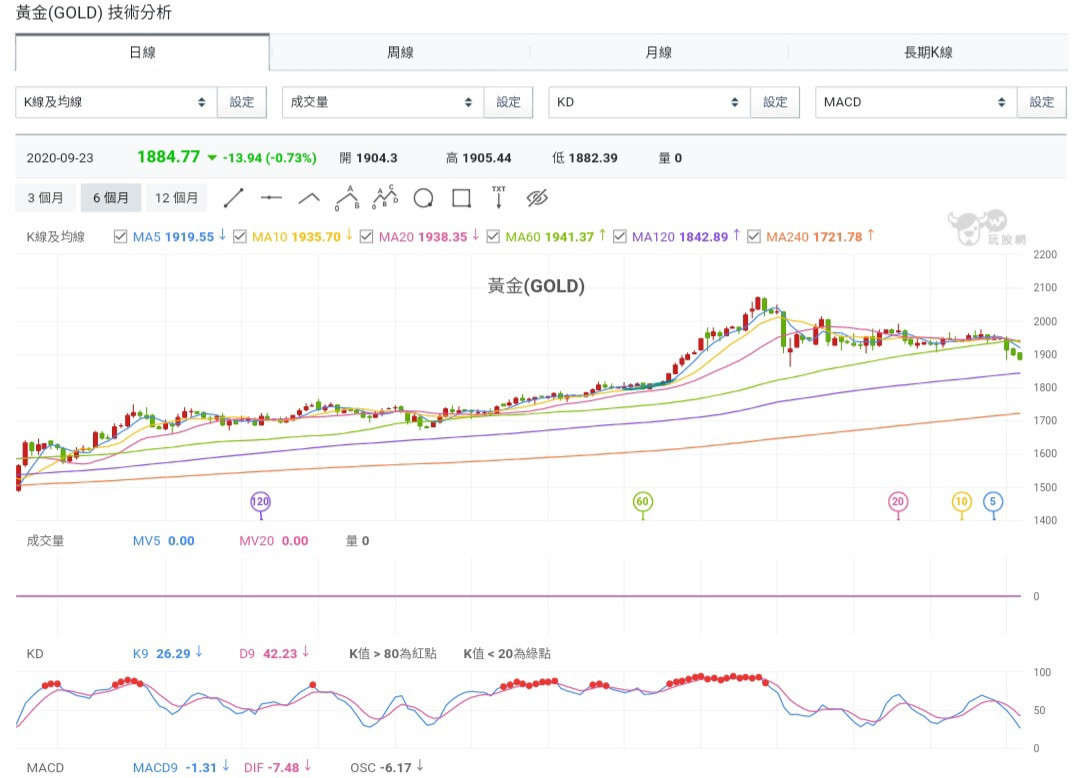 月月均線上升速度減緩,但仍保持上揚,記住!均線有支撐價的作用所以10月月均線位子1908,這就是告訴你注意9月收月線的價應該收在那裏,金價才會持續走強。