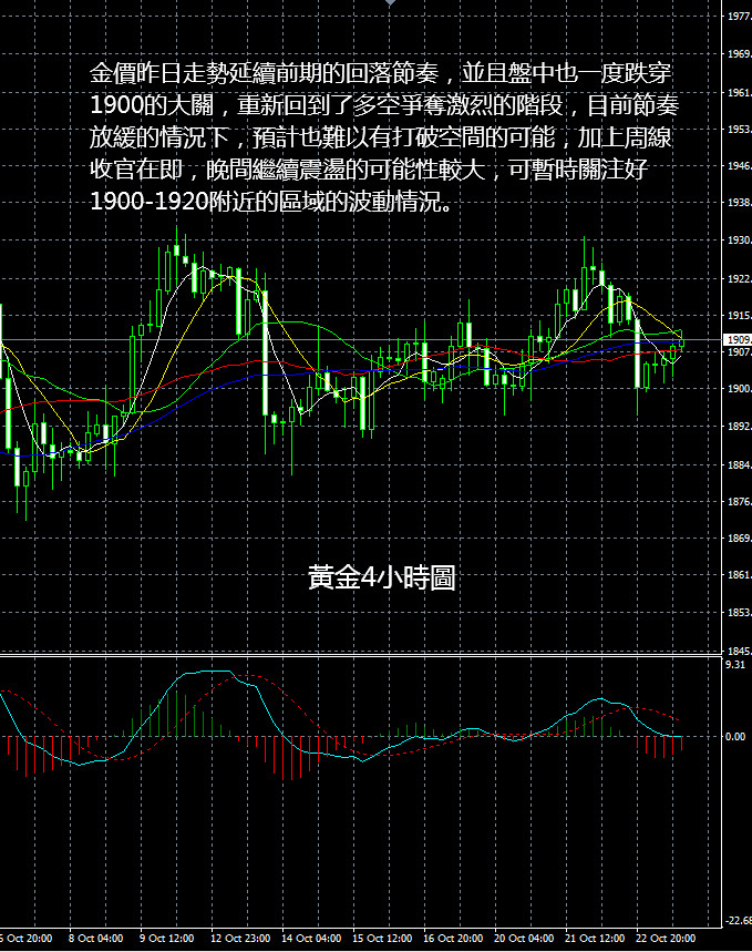 從現貨黃金4小時圖看,金價昨日走勢延續前期的回落節奏,並且盤中也一度跌穿1900的大關,重新回到了多空爭奪激烈的階段,目前節奏放緩的情況下,預計也難以有打破空間的可能,加上周線收官在即,晚間繼續震盪的可能性較大,可暫時關注好1900-1920附近的區域的波動情況。 從現貨黃金1小時圖看,早間亞盤時段黃金逐步企穩陣腳後,多頭開始有所反擊,儘管力度不算太大,但是目前重新處於1910附近,也意味著下方的支撐效果依然不俗,現階段短期均線組再度拐頭向上,MACD指標也在延續金叉開口,晚間或者還會有一定的反彈空間,儘管幅度有限,操作上建議美盤早段低多為主,但觀察節奏配合高空。