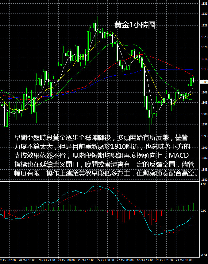 從現貨黃金1小時圖看,早間亞盤時段黃金逐步企穩陣腳後,多頭開始有所反擊,儘管力度不算太大,但是目前重新處於1910附近,也意味著下方的支撐效果依然不俗,現階段短期均線組再度拐頭向上,MACD指標也在延續金叉開口,晚間或者還會有一定的反彈空間,儘管幅度有限,操作上建議美盤早段低多為主,但觀察節奏配合高空。