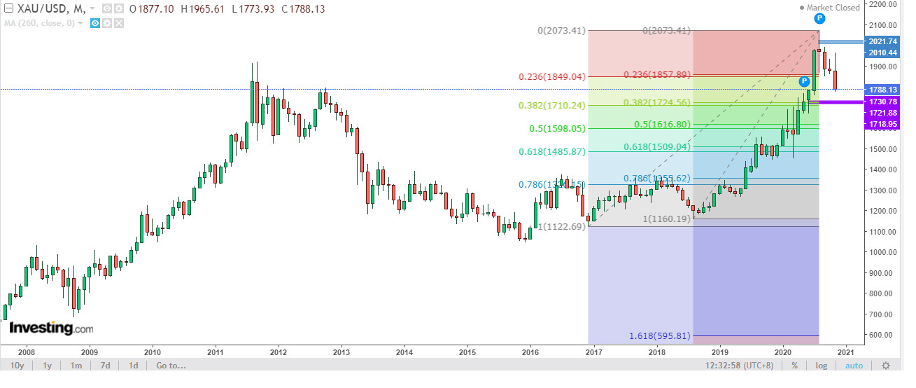 因為金價做了一個大圓底(碗形、杯形),左碗頂1920.85,碗底1046.22,當突破1920.85完成,目標增長價期望是碗頂到碗底幅度的1倍,即1920.85+874.63=2795.48,這也就是有些人目標看2800的其中一原因(如用黃金回吐比率計即顯示2倍[回一倍874.63反彈到原點再多1倍874.63]的位置,但圖表限制顯示不了出來),但是個人認為圓底1倍的機率不是很高,加上大勢月線5浪仍未明顯出現,5浪的ABC下降浪暫不可測,假設這八九年是在大勢4浪的調整中,那麼5浪的反升反而到原點再多0.618倍以上的機率較大,圖表限制一樣不能顯示1.618倍的計算,那只好自己計算