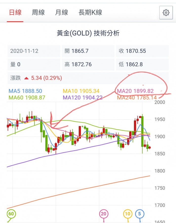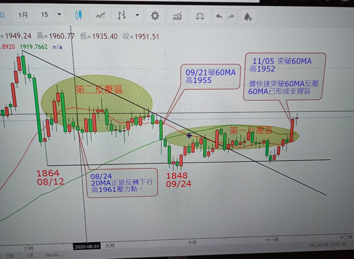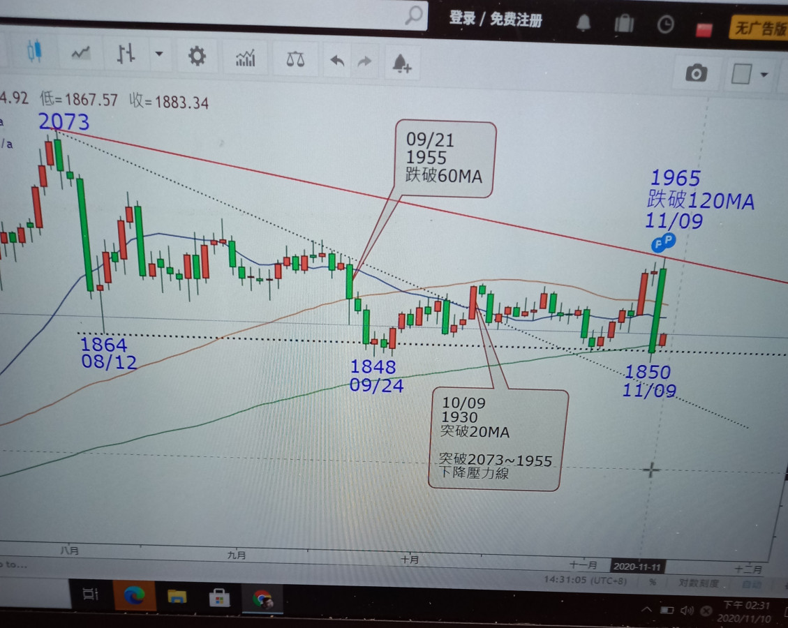 本週(11/13)要盡快站上20MA(並且要盡快穿過60MA),如果站上20MA那就是(假跌破)1864,如果站不上20MA那就是(真跌破)1864。