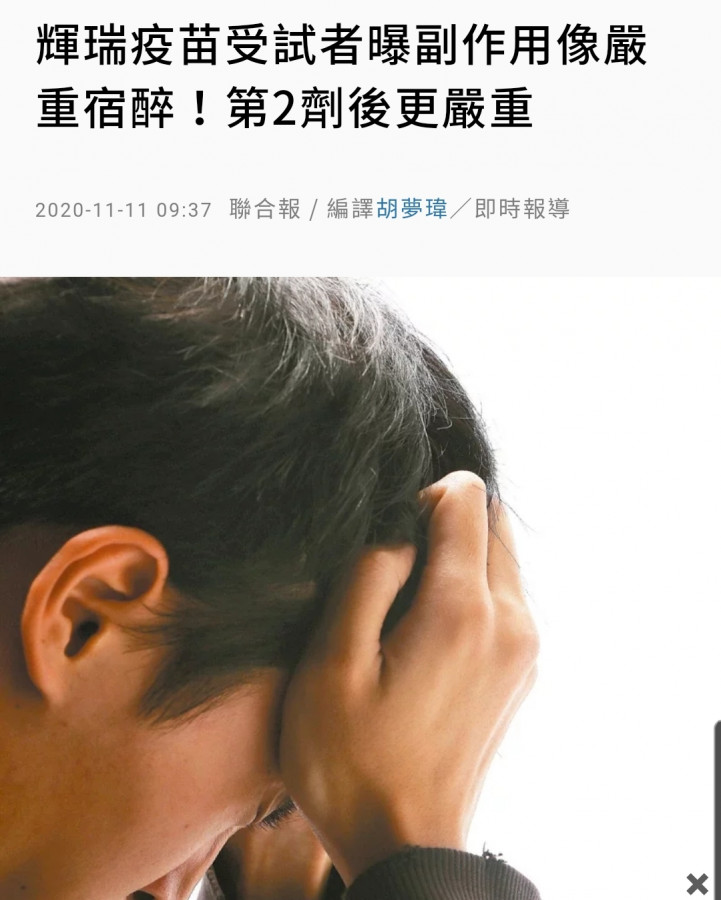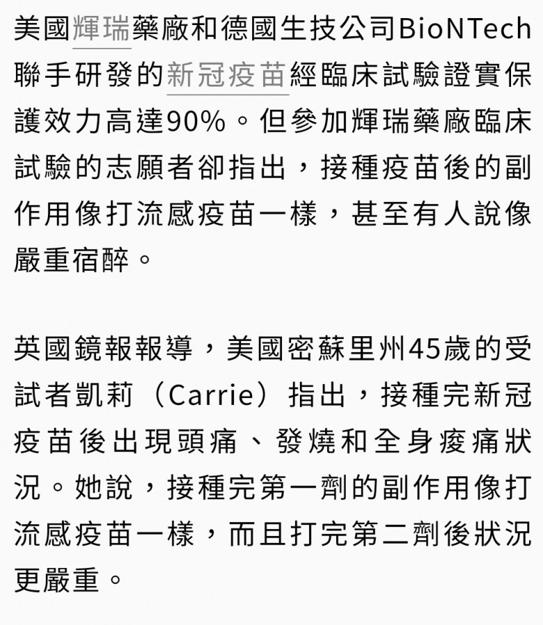 mRNA是輝瑞與德國生技公司BioNTech共同開發,周一公布疫苗效力後當日股價漲近15%,但由於BioNTech早在10月就公布同樣消息並送EMA(歐洲藥品管理局)審核,輝瑞此動作之前已經被質疑刻意挑在美國大選後才公布以免有利現任總統川普(Donald Trump),周二也有受試者爆料輝瑞隱瞞疫苗有類似強烈宿醉副作用事實。
