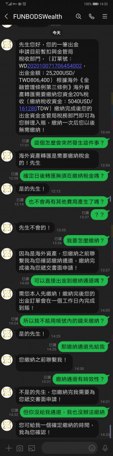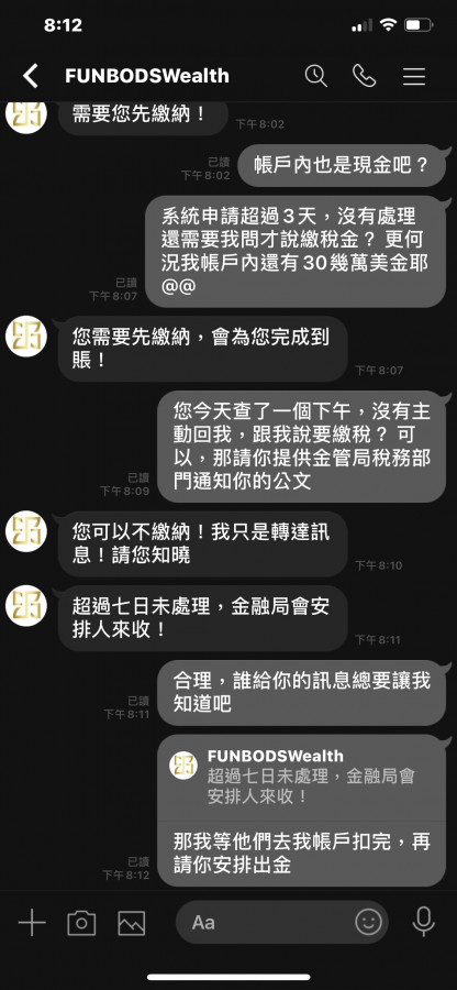 安排人員進入各個交友網站,進行交友詐騙,鼓吹加碼,到後面想要出金就會說金管局稅務單位要求繳20%稅金,而且只能另外匯入,可是又拿不出公文證明,最終還恐嚇會找人來收稅金,他們要的是錢不會出人命或希望他們下手輕一點,正規經營商會這樣玩的嗎? 很明顯的黑平台,已經在用的就不要再入金了,還沒開始的請遠離,入金就無法出金還會找各種理由要求再繳錢。