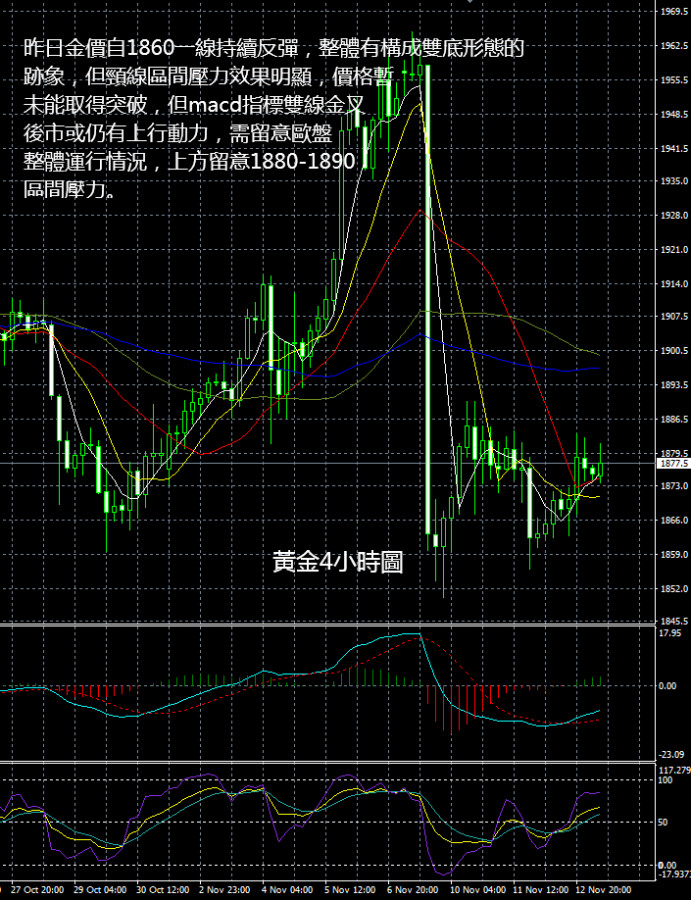 從現貨黃金4小時圖看,昨日金價自1860一線持續反彈,整體有構成雙底形態的跡象,但頸線區間壓力效果明顯,價格暫未能取得突破,但macd指標雙線金叉後市或仍有上行動力,需留意歐盤整體運行情況,上方留意1880-1890區間壓力。