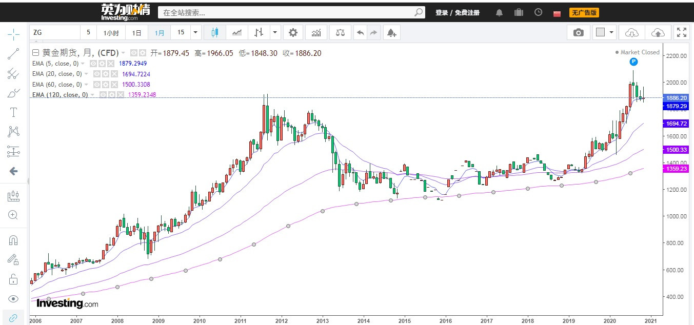 90%一定很多人都不會注意看、仔細看、用心看黃金的月K線圖5/10/20月均線(上升陡峭角度),為何如此陡峭走勢呢?