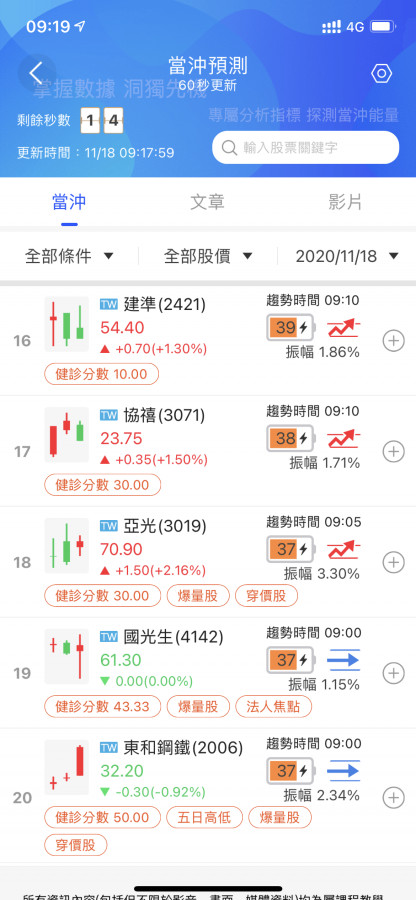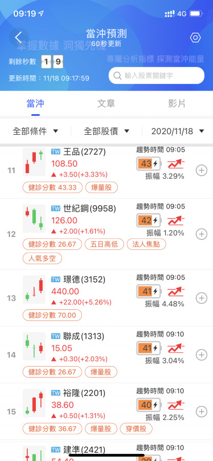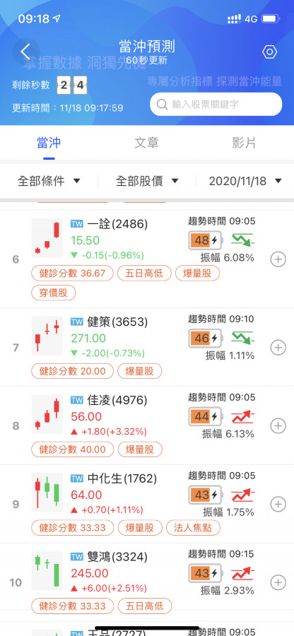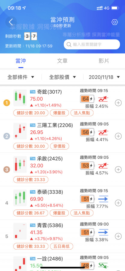 AI 功能自動選出 適合當沖的股票。分數高的約適合的樣子。