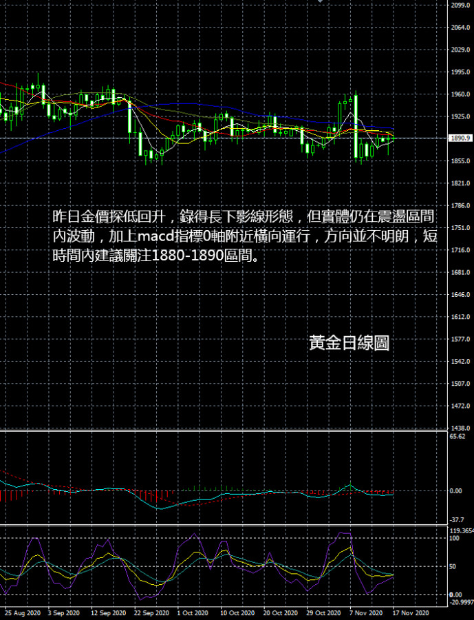 從現貨黃金日線圖看,昨日金價探低回升,錄得長下影線形態,但實體仍在震盪區間內波動,加上macd指標0軸附近橫向運行,方向並不明朗,短時間內建議關注1880-1890區間。