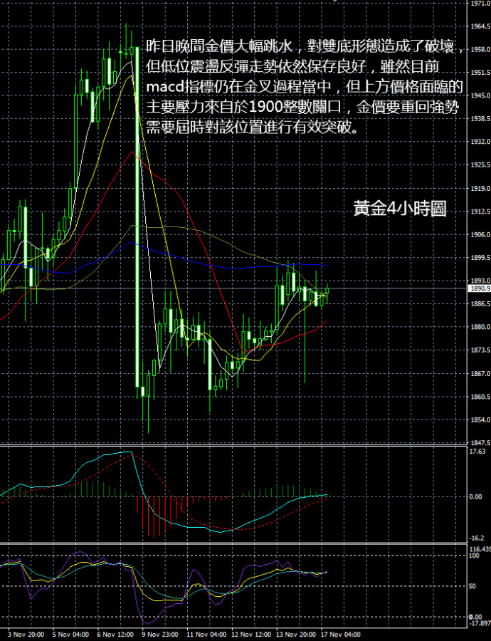從現貨黃金4小時圖看,昨日晚間金價大幅跳水,對雙底形態造成了破壞,但低位震盪反彈走勢依然保存良好,雖然目前macd指標仍在金叉過程當中,但上方價格面臨的主要壓力來自於1900整數關口,金價要重回強勢需要屆時對該位置進行有效突破。