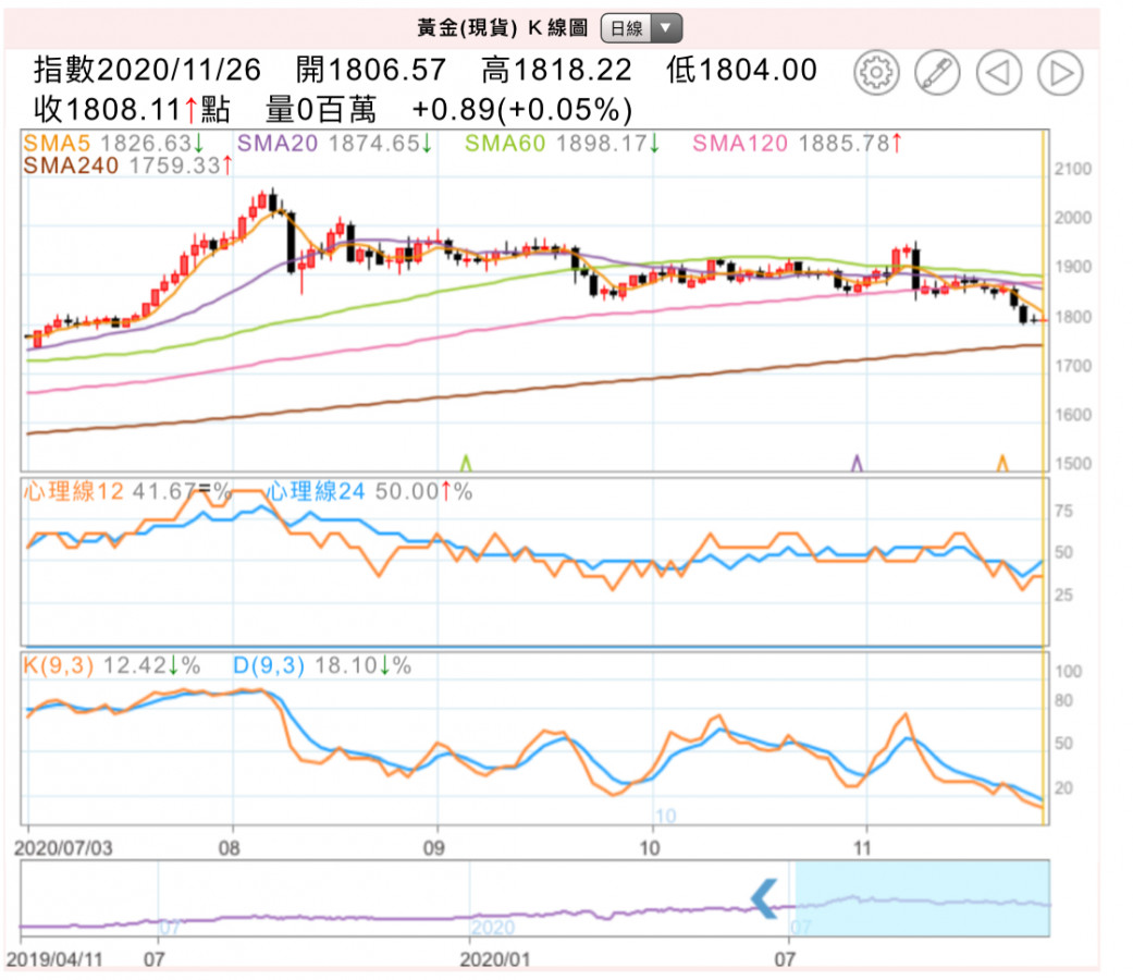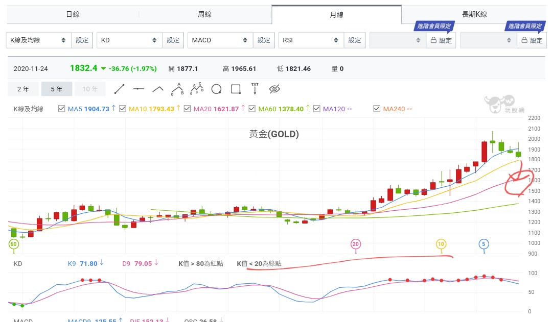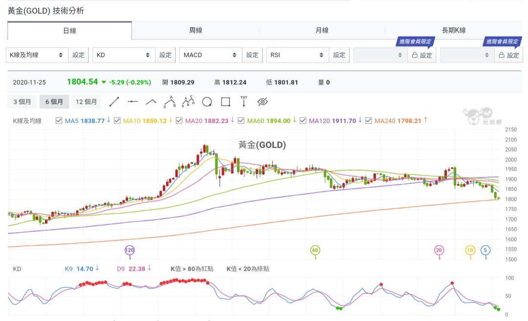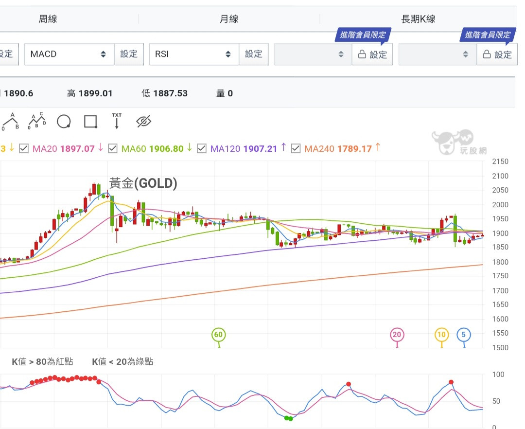 無心認為配合二個月(60/120)交叉後的漲勢,黃金價格是有必要的進行修養在(120上下~240上下)日均線價。