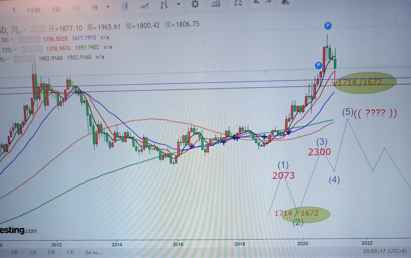 從月線圖中的紅色圈點是目前20月均線價1621,以(價~回測均線)來說,目前看月線圖是應該持續進行的修正,所以回頭看日/週圖,……那麼無心只能說(日/週圖,價~雖然修正近尾聲),但是在未來(60/120)二個月交叉前,日/週~價將會在120/240日均線線中來回盤整,也就是說價會先反彈後再一次跌破240日均線價的可能,但是深度並不會太深大概1700附近,這樣就能使KD指標回落至60以下,這樣才能滿足月線的修正時間波。