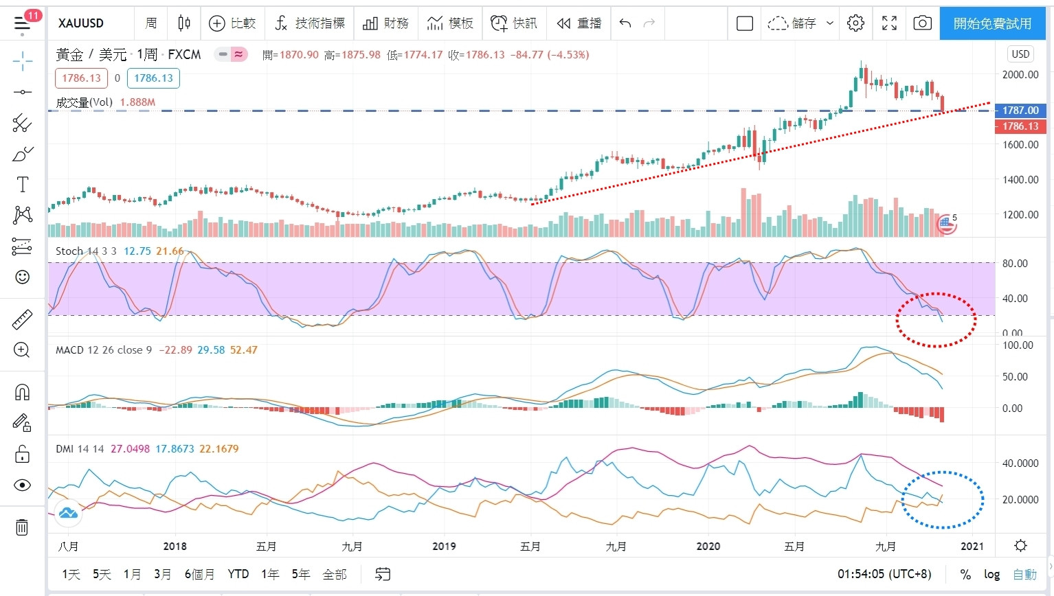 但同時,週dmi指標也在11/27死亡交叉(藍色圓框),