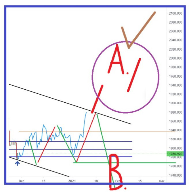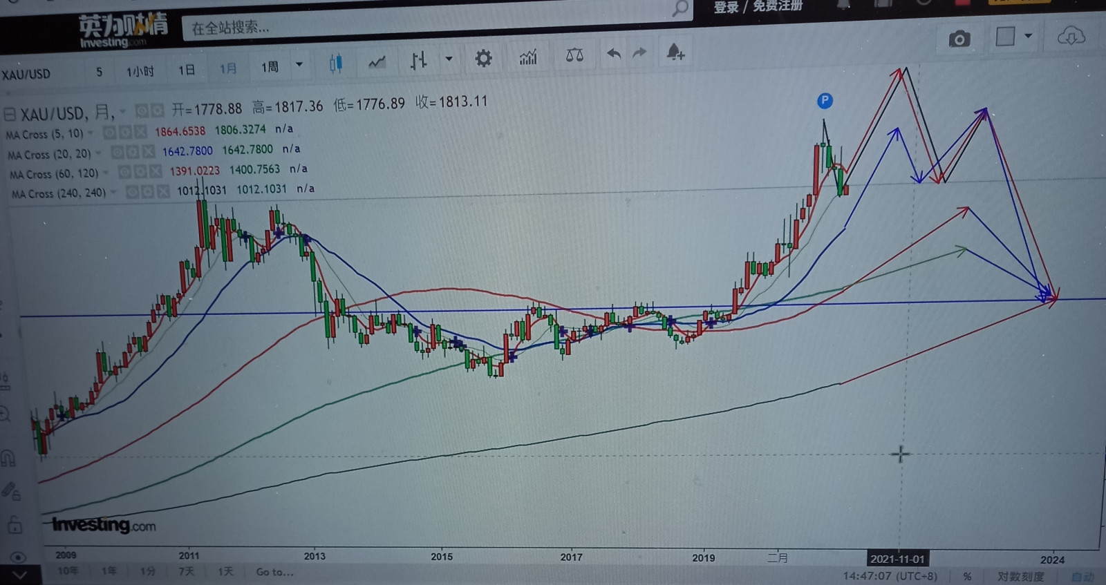 整體盤勢強度看7月長紅K,8/9/10/11月四個月黑K吃不掉一個月長紅K,這就屬強勢盤,強勢修正價與指標,也就是無心說的(跌K值,價不跌),嚴格說要以1920來計算跌勢強弱,要跌破那裡黃金才正式走空呢?……自己去看歷史區。