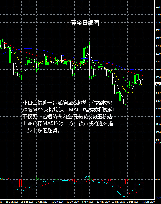從現貨黃金日線圖看,昨日金價進一步延續回落趨勢,價格收盤跌破MA5支撐均線,MACD指標亦開始向下拐頭,若短時間內金價未能成功重新站上並企穩MA5均線上方,後市或將迎來進一步下跌的趨勢。