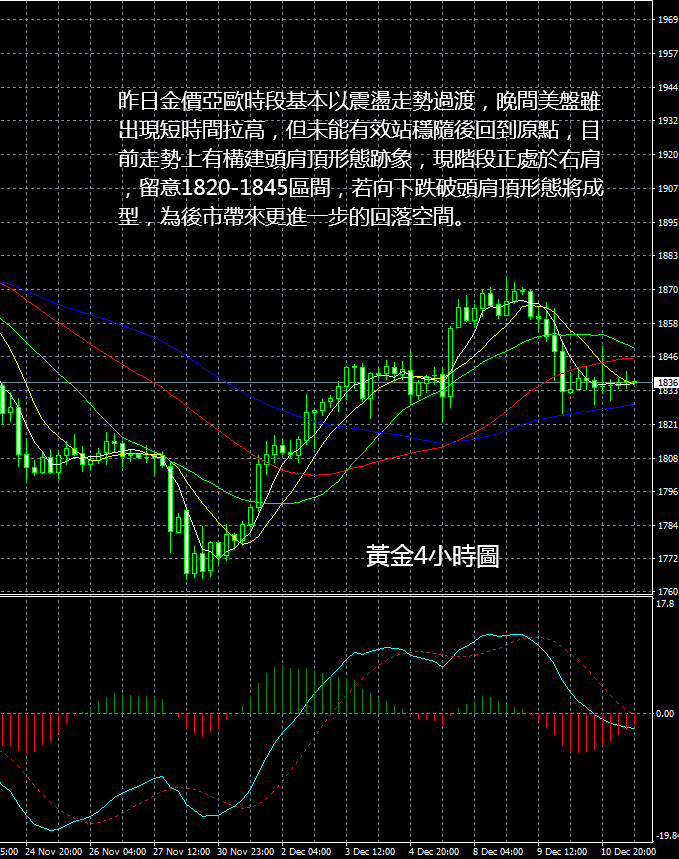 從現貨黃金4小時圖看,昨日金價亞歐時段基本以震盪走勢過渡,晚間美盤雖出現短時間拉高,但未能有效站穩隨後回到原點,目前走勢上有構建頭肩頂形態跡象,現階段正處於右肩,留意1820-1845區間,若向下跌破頭肩頂形態將成型,為後市帶來更進一步的回落空間。