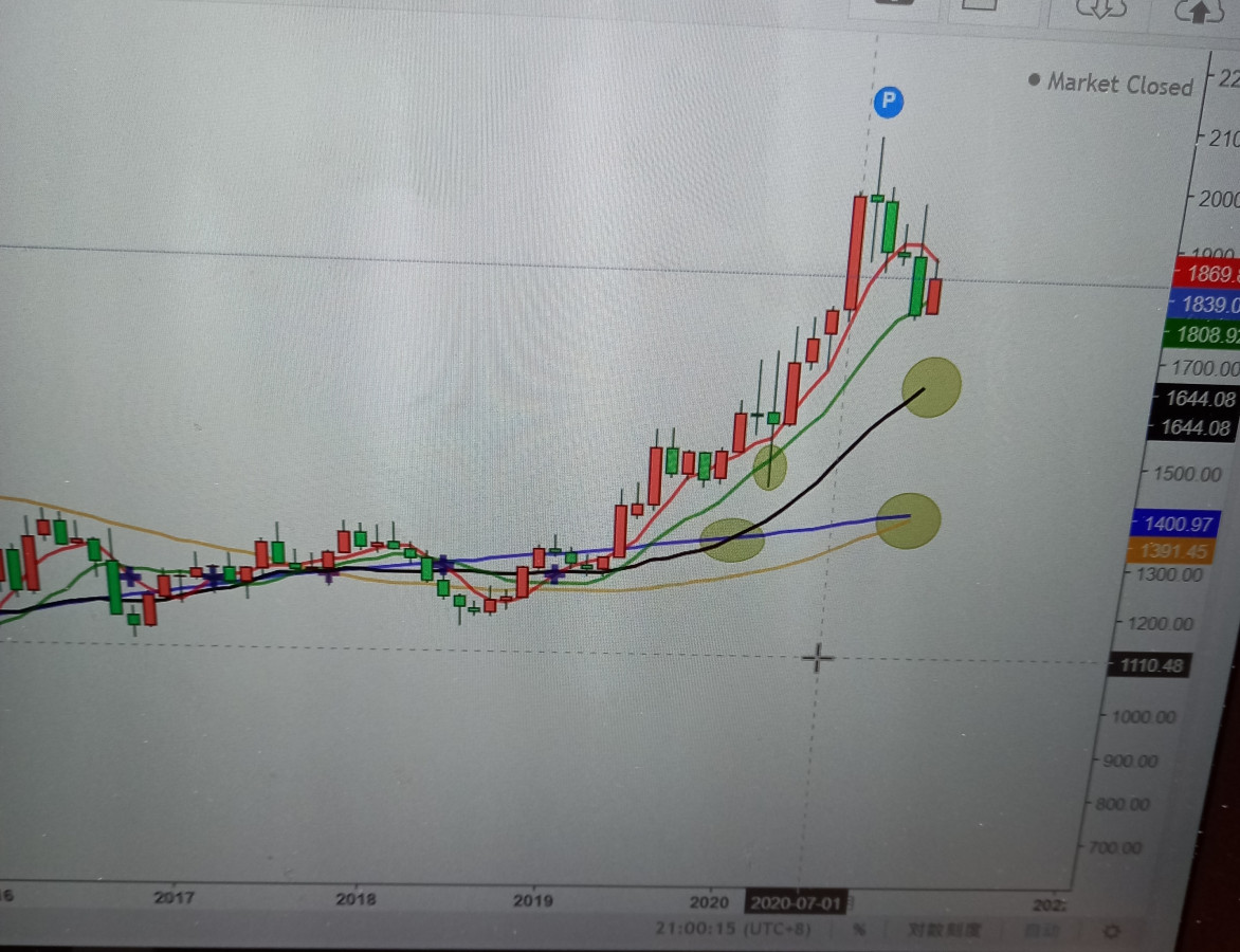 再看有人說要跌到1500位置,這說法是依憑月線圖中的月KD值(65)仍然持續下跌且開口甚大,目前都未有收斂跡象,所以說要跌到1500的位置是有可能的,跌到1500位置就相當於5/10月均線死亡交叉了……那就真的一去不回頭了。